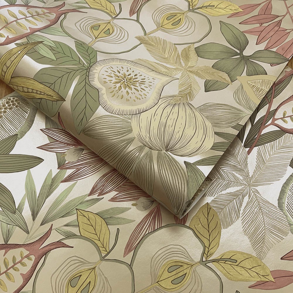Bring a vibrant, exotic feel to your home with this delightful wallpaper design. Pomegranates, figs, and apples are artfully arranged amongst lush foliage, creating a colourful and lively scene. This fresh design is printed on high-quality matt paper for a luxurious finish.