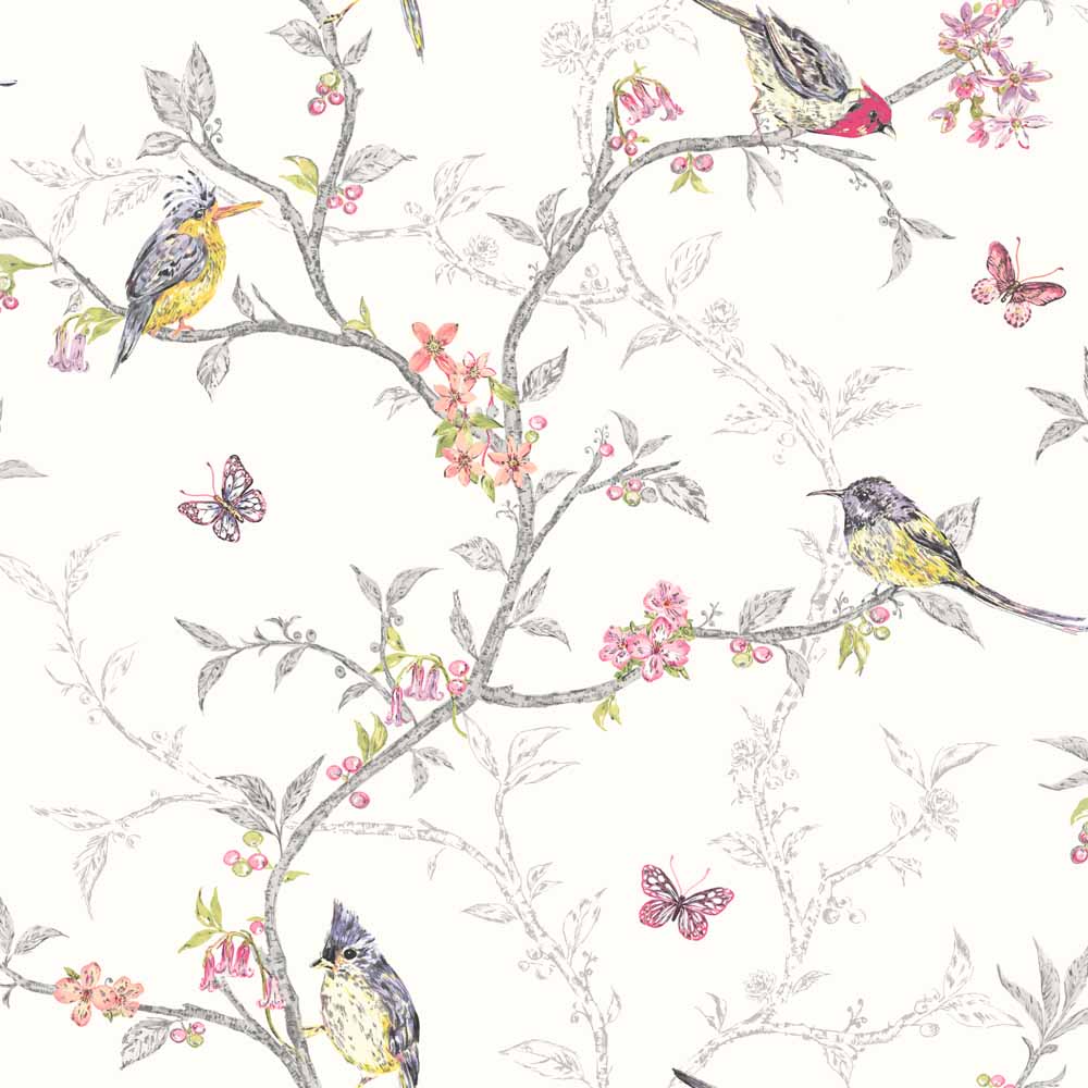 Enliven your walls with this captivating wallpaper. Butterflies flit amongst a charming bird trail, all set against a shimmering mica silhouette branch trail. Easy to install with paste-the-paper application, this wallpaper has a 26.5cm offset and 53cm repeat. Each roll measures 10.05m long and 53cm wide.
