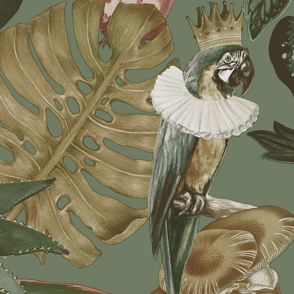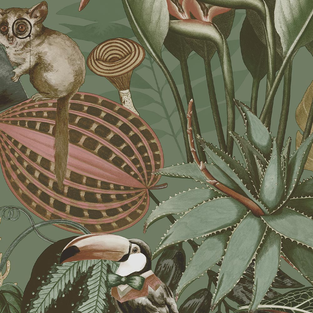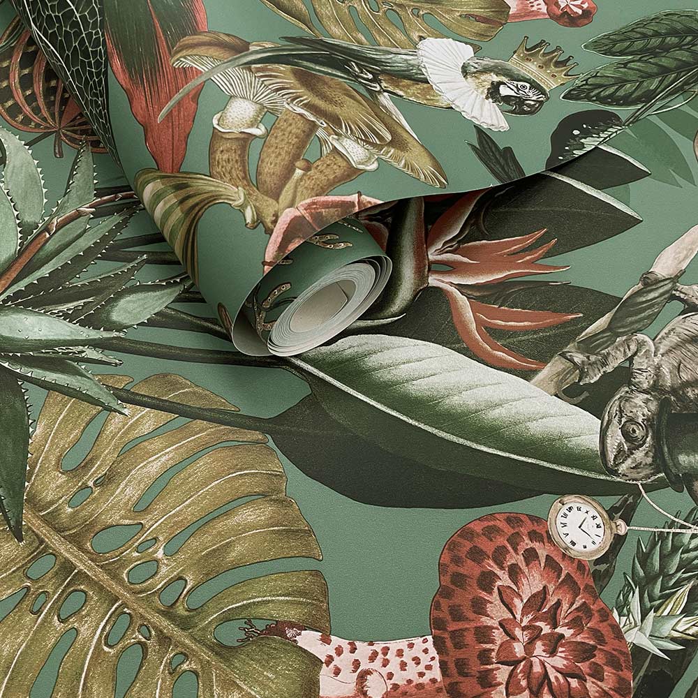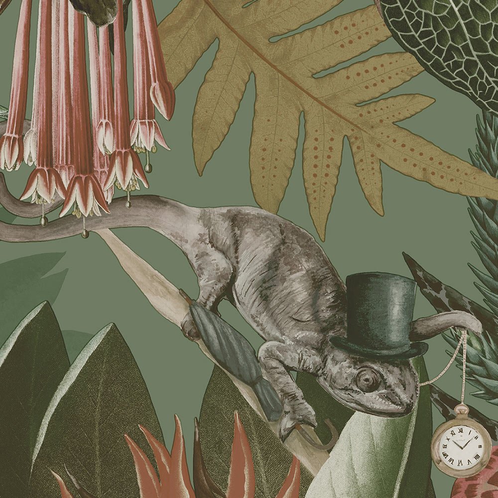 Wonderland Sage Wallpaper adds a touch of whimsical tropical flair to any room. Parrots in crowns, chameleons sporting top hats, and bush babies with monocles create a vibrant and fun design. Perfect for a feature wall, this smooth, spongeable wallpaper is made with high-quality, FSC-certified materials. Paste the paper for application. Each roll measures 10.05m long and 53cm wide, with an offset design match and a 64/32cm repeat. Available in a sage green colourway.