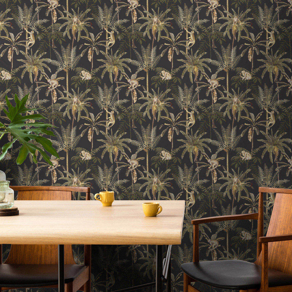 Bring the vibrant energy of the rainforest into your home with the Holden Monkey Oasis Charcoal Wallpaper. This stylish wallpaper showcases a painterly design of spider monkeys swinging through palm trees, all set against a sophisticated matte charcoal background. Printed on an environmentally responsible FSC-certified substrate, this bold and trendy wallpaper is perfect for adding a touch of the exotic. Each roll measures 10.05m in length and 53cm in width, with a 53cm straight match. Paste the paper for easy application.