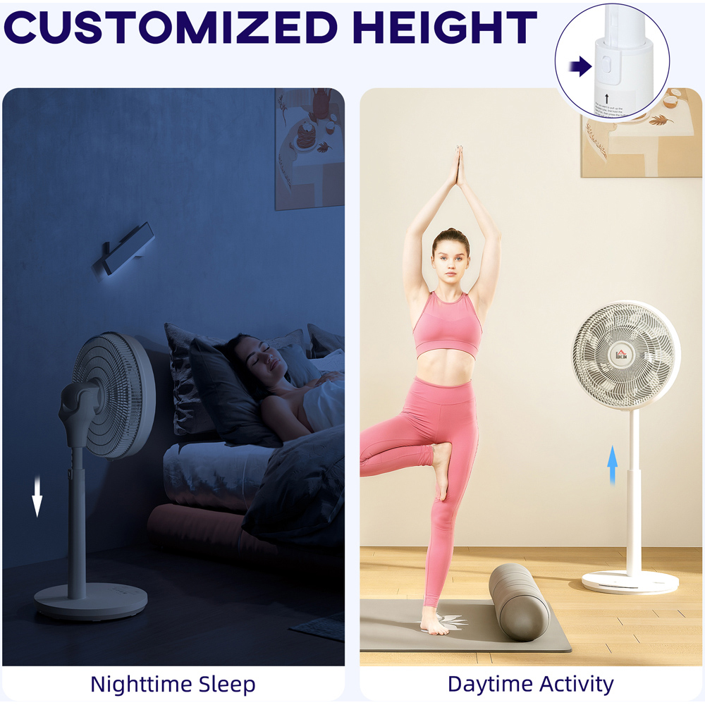 Discover the quiet comfort of the HOMCOM White Oscillating and Tilt Pedestal Fan, featuring a DC motor that ensures energy-efficient, whisper-soft airflow. It delivers strong airflow while using 50% less energy than an AC motor, ensuring 30 dB quiet operation for minimal disturbance, suitable for peaceful nights or focused work. Equipped with three modes (normal/natural/sleep) and 12 speeds, this oscillating fan offers personal cooling, including simulating real wind. Easily controlled via remote or panel, complete with an LED display for status monitoring. Enjoy cooling with an auto 80-degree horizontal oscillation, manually adjustable 90° vertical tilt and 90-110cm adjustable height, making this tall fan great for comprehensive ventilation whether in living rooms, bedrooms, or home offices.