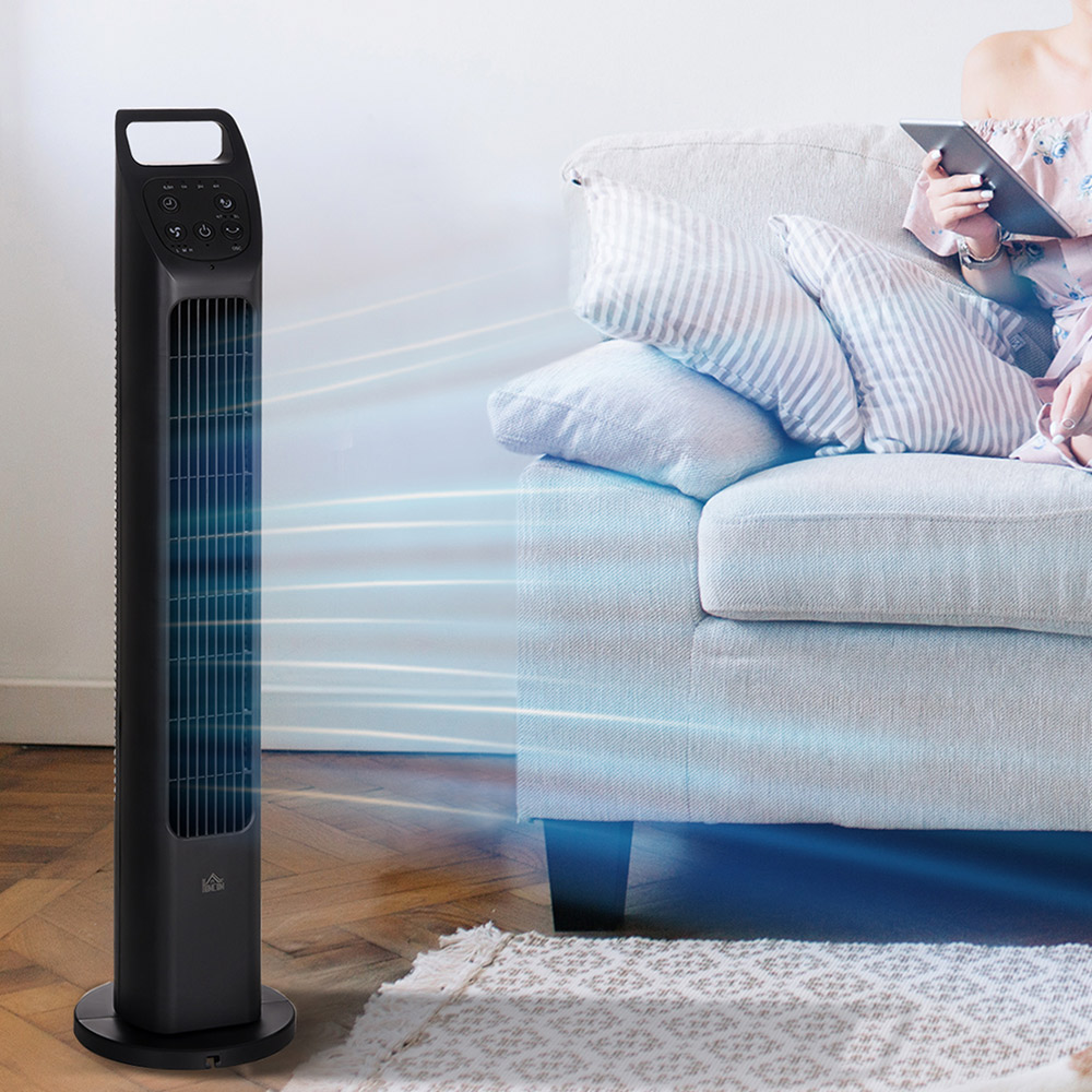 Breeze through balmy nights with the HOMCOM 31-inch Black Tower Fan. Simple to operate, this tower fan is the perfect addition to your home or office. Choose from nine settings, switching between low, medium, and high speeds, as well as normal, natural, and sleep modes, for a truly customisable cooling experience. Its 75-degree oscillation ensures everyone in the room enjoys the refreshing breeze, while the four-hour timer lets you schedule your cooling.