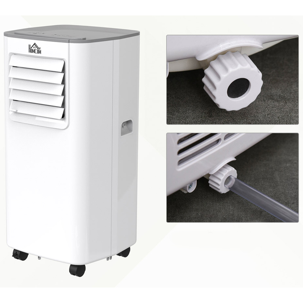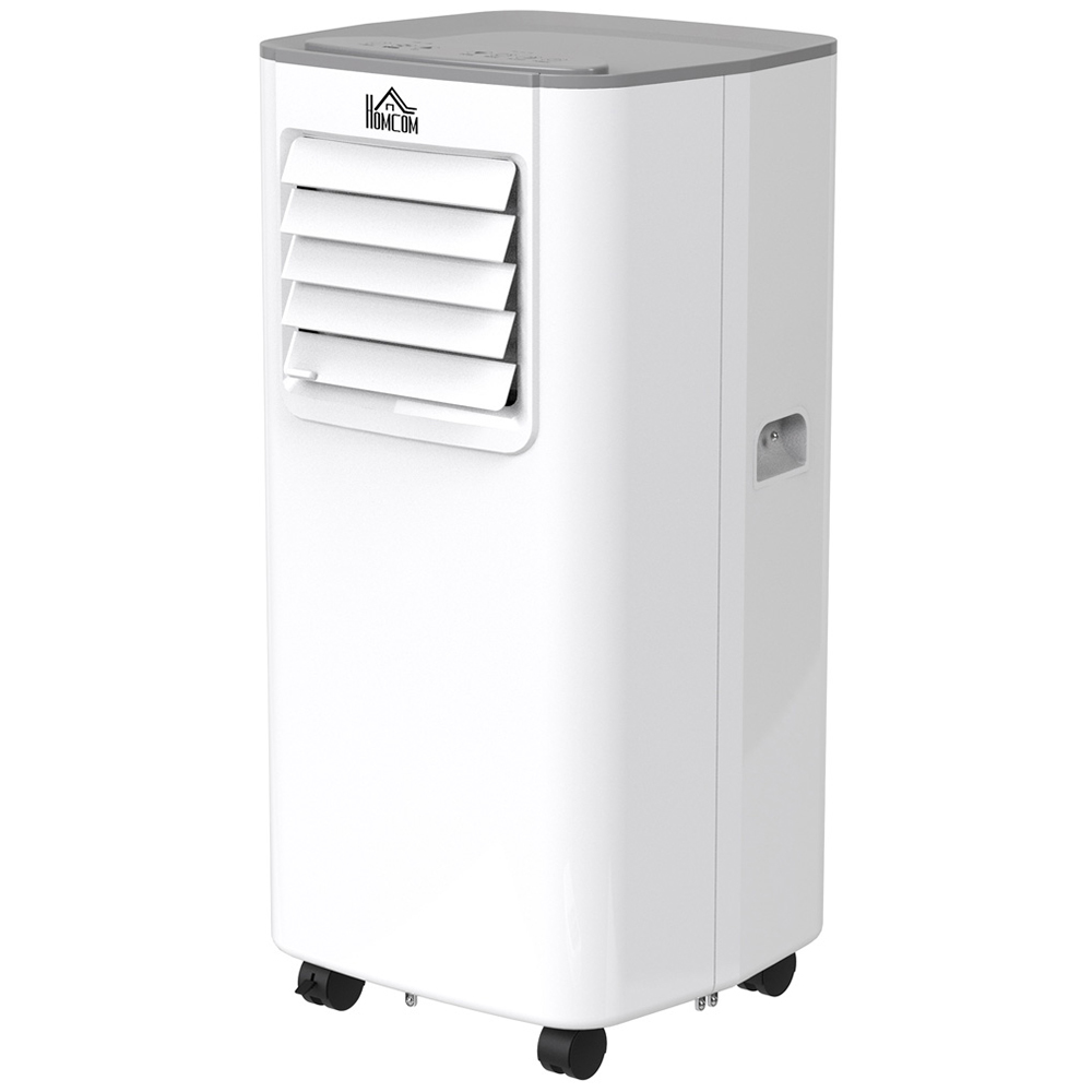 Banish the heat with the HOMCOM 4-in-1 White Air Conditioner, a versatile solution for year-round comfort. This multi-functional unit not only cools but also ventilates, dehumidifies, and offers a dedicated sleep mode. Designed for continuous use in varied climates, it cleverly prevents overfilling with an automatic shut-off when the tank is full. A 24-hour timer provides tailored operation, ideal for saving energy overnight. User-friendly controls include an on-unit LED screen and a handy remote. A removable air filter ensures the air remains clean and fresh. Please note: remote control requires 2 x AAA batteries (not included).