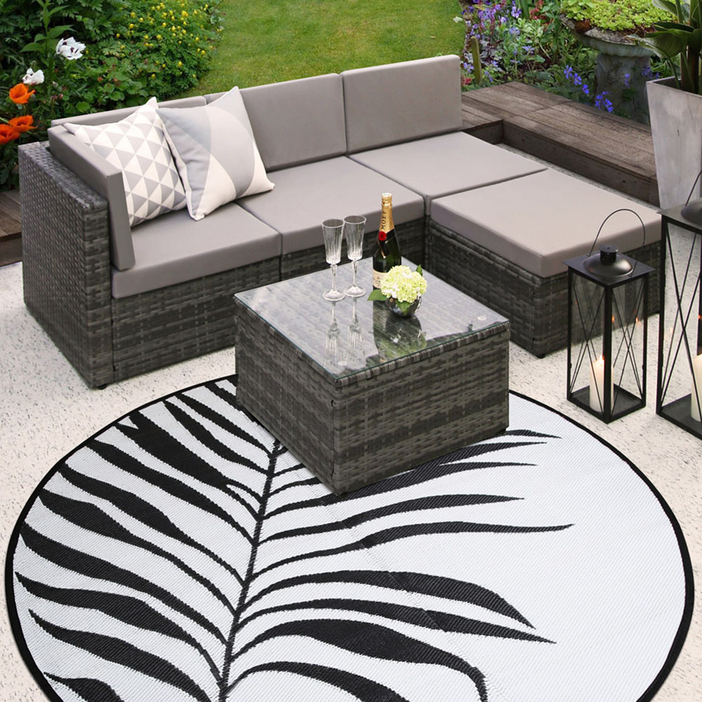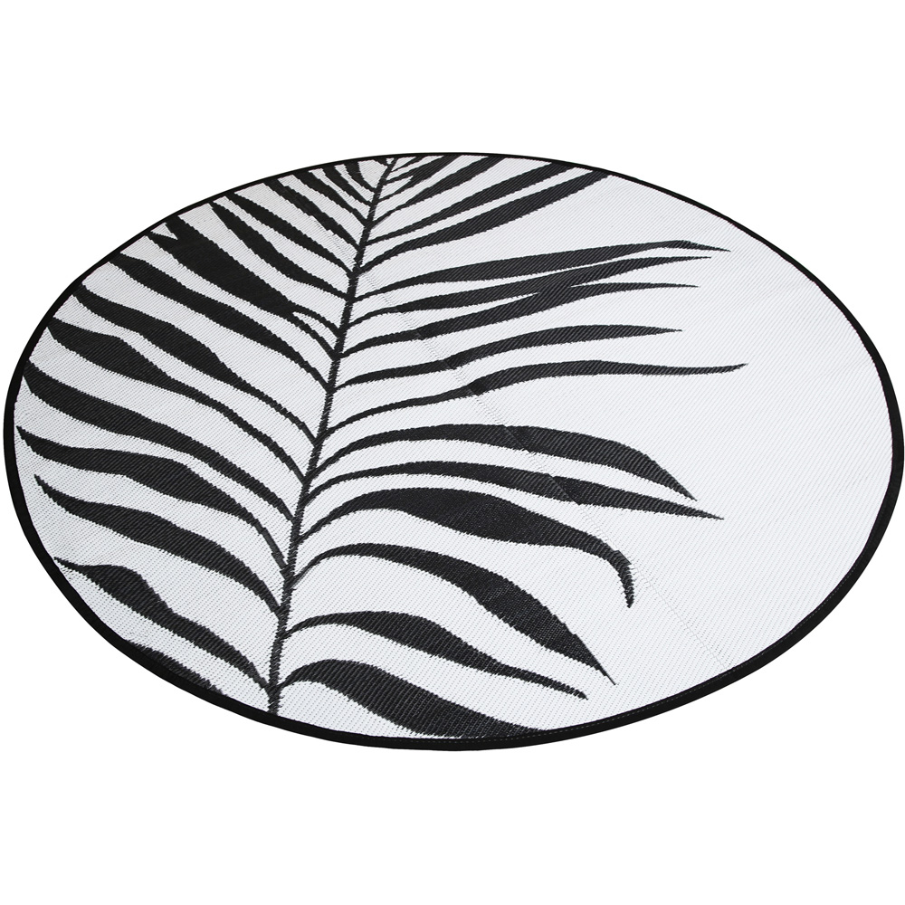 Transform your outdoor space with the Jupiter round outdoor rug. Crafted from durable, 100% polypropylene tube weave, this rug boasts a striking black and white pattern. Perfect for patios, decks, or larger outdoor areas, its generous 200cm diameter comfortably accommodates dining sets or lounge furniture. This stylish rug is designed for outdoor living, resisting mildew and stains with its easy-wipe surface. UV resistant and completely waterproof, its vibrant colours will endure even with prolonged sun exposure and rain showers. The quick-drying material ensures it's always ready to use, and its lightweight, foldable design makes storage and transportation effortless. A practical and elegant addition to any outdoor setting.