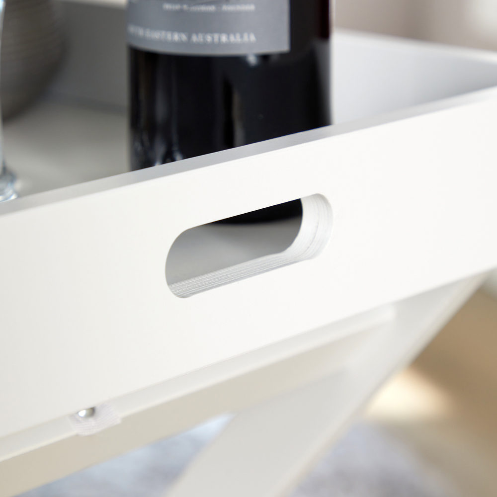 This stylish and practical tray table, finished in white, is crafted from MDF with a durable lacquer. Designed to complement any home décor, it's the perfect addition to your home. Delivered flat-packed for convenient self-assembly at home. Dimensions: (W) 60cm x (D) 40cm x (H) 70cm.