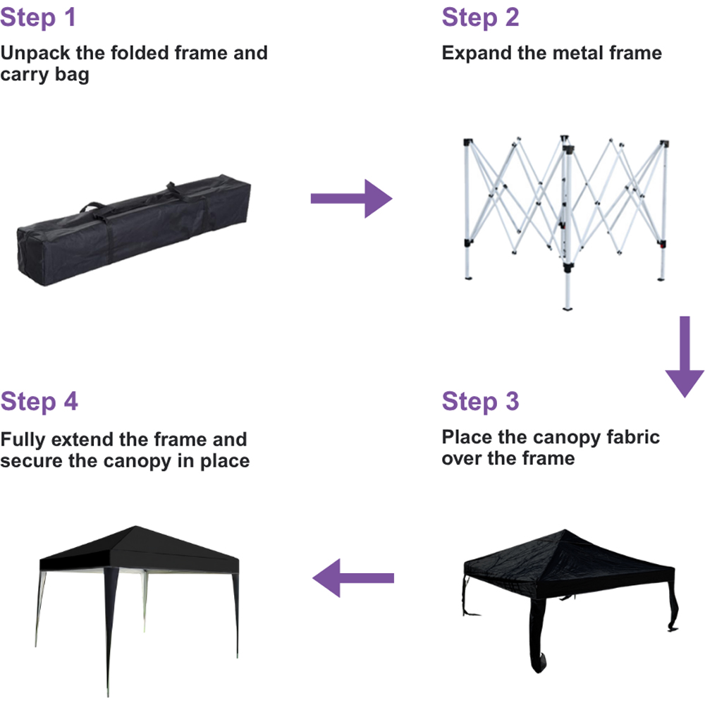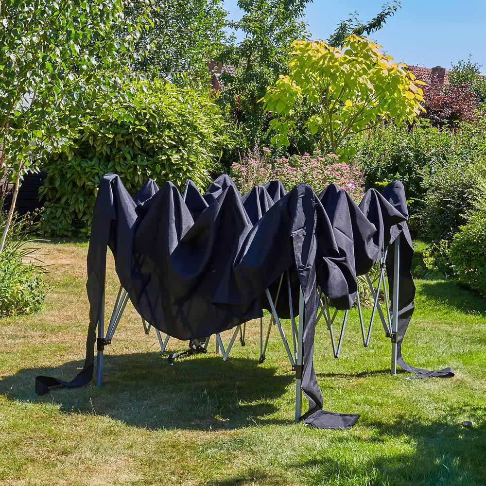 Erect a shelter in mere minutes with this Easy-Up Gazebo, your instant solution for sun and rain protection, making it ideal for use in so many ways. Perfect for garden parties, village fêtes, car boot sales, or creating temporary cover whilst decluttering the garage or shed. It’s also ideal for watching sports outdoors, allowing you to enjoy the match and catch some rays under the TV. From packed to pitched in moments: simply pull the corners, secure the fabric, and extend the legs. Equally quick to dismantle, it packs down to a compact 115 x 20 x 20cm for easy transportation in your car or storage in the garage, shed, or loft. Size: W3m x D3m.
