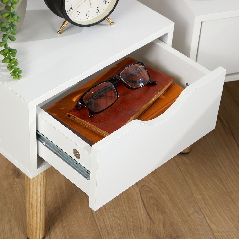 Keep your nighttime necessities within easy reach with these bedside units. Each unit features a generously sized drawer, making it an essential addition to any bedroom. Finished in a contemporary white, with sturdy solid wood legs, these units offer a modern and stylish aesthetic that complements any bedroom décor. Dimensions: (W) 30cm x (D) 30cm x (H) 32.5cm.