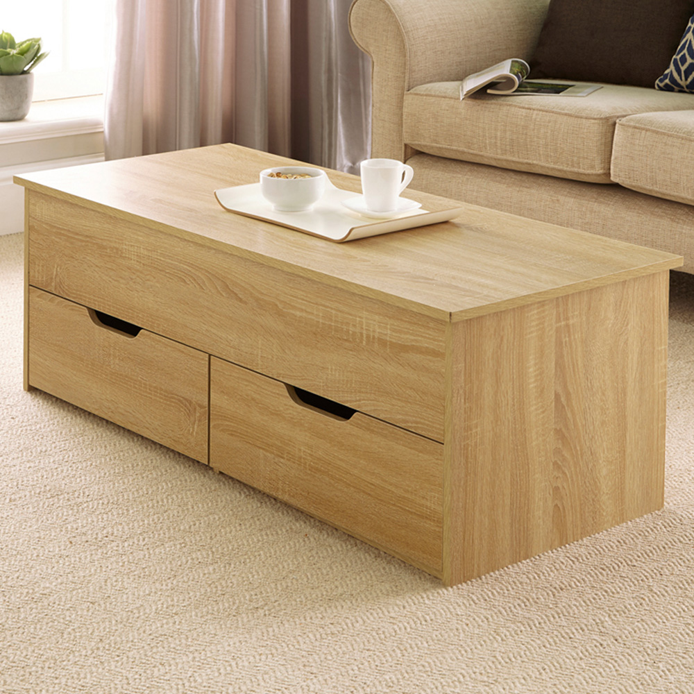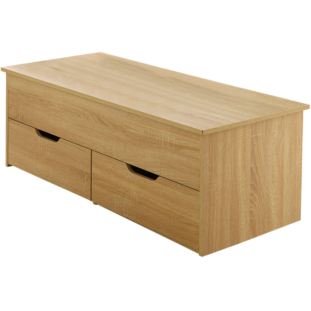 The Bruges Coffee Table, finished with a warm, natural Oak effect, provides ample storage for your living room. Beneath the lift-up lid, discover two storage compartments, complemented by two base drawers featuring smooth, quiet metal runners. This provides a total of four dedicated spaces perfect for stowing books, glasses, puzzles, pens, remote controls, jigsaws, and more. The tabletop offers a versatile surface for displaying books, plants, flowers, or figurines. Alternatively, use it as a convenient spot for drinks, snacks, TV dinners, or even working online, with the top pivoting for optimal access. Dimensions: (W) 115cm x (D) 50cm x (H) 40cm.