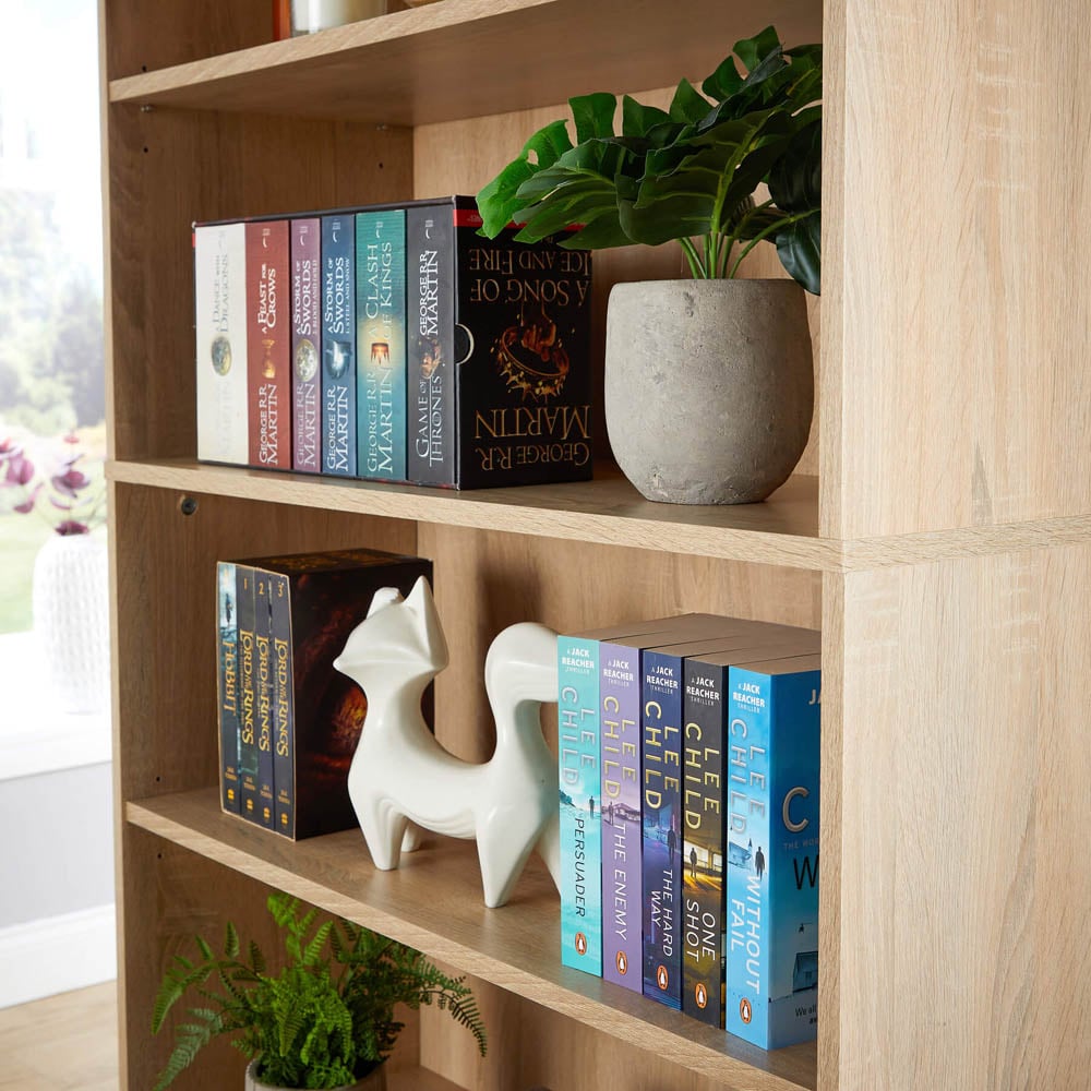 Bring organisation and style to your home with the Clara 5-Shelf Bookcase. Boasting five generously sized adjustable shelves, it provides abundant space for showcasing your favourite books and decorative items. Complete with two integrated storage drawers, it's ideal for stowing away everyday essentials. Finished in a warm oak effect, this bookcase arrives flat packed for straightforward self-assembly. Size: (W) 78cm x (D) 29cm x (H) 180cm.