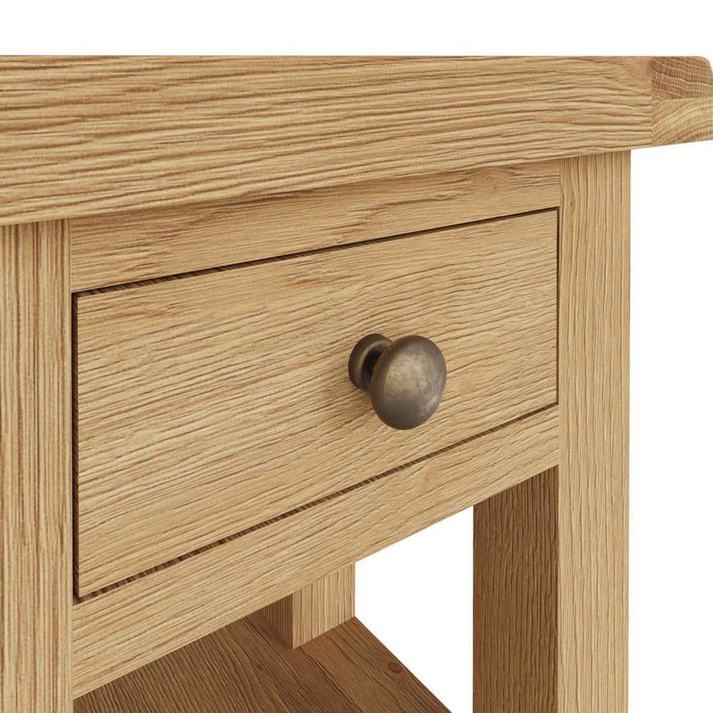 Create an inviting space with Home Source Copenhagen Single Drawer Solid Wood Oak Veneer Side Table. Crafted from solid oak and real oak veneer, it has a natural finish. The antique brass effect handle gives it a timeless touch, while the sturdy build ensures it lasts for years. The drawer is traditionally made with real dovetailed joints for added strength, and the handy undershelf provides extra storage for books, decor items or everyday essentials.