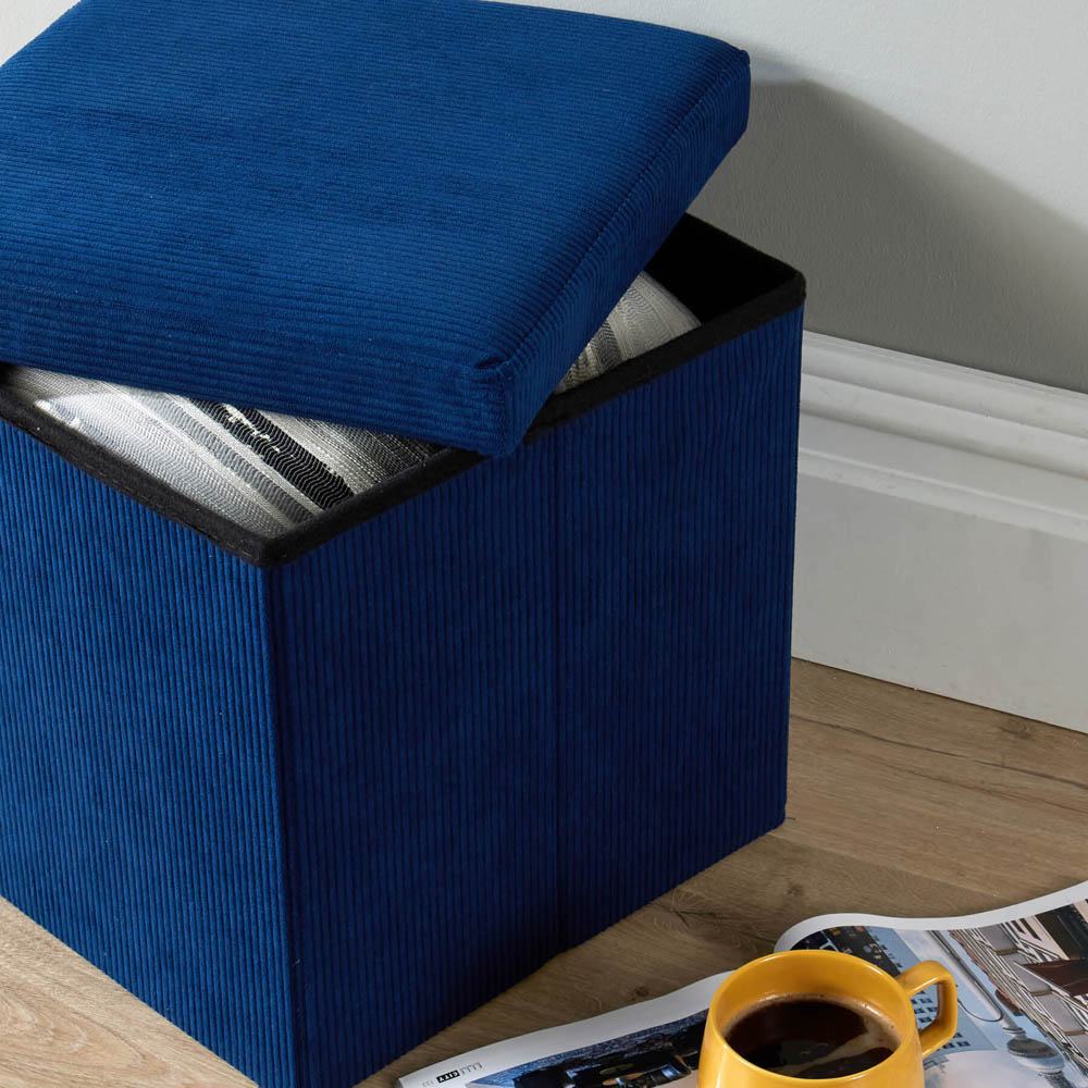 Declutter your home in style with this square ottoman, crafted with eye-catching corduroy that subtly plays with light and shadow. Ideal for stowing away clothes, shoes, reading materials, paperwork, bedding, towels, and toiletries, this storage box offers a practical solution for reclaiming floor space. When not in use, it conveniently folds flat for compact storage – delivered to you in this space-saving format. Dimensions: 38cm (W) x 38cm (D) x 38cm (H).