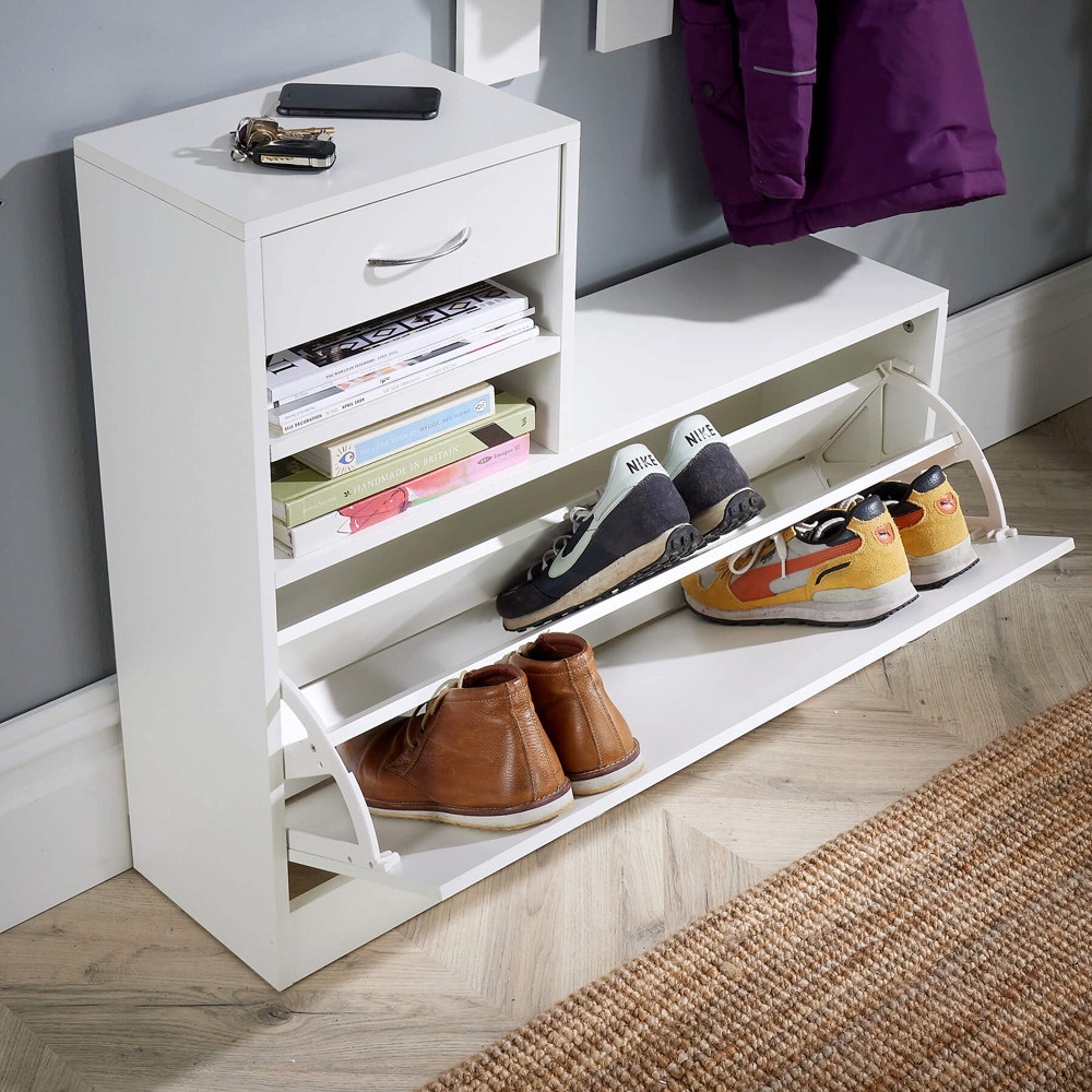 Home Source Darfield White Single Drawer 2 Shelf Shoe Cabinet with Mirror and Coat Hook