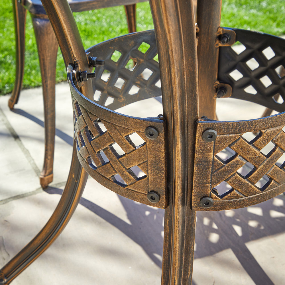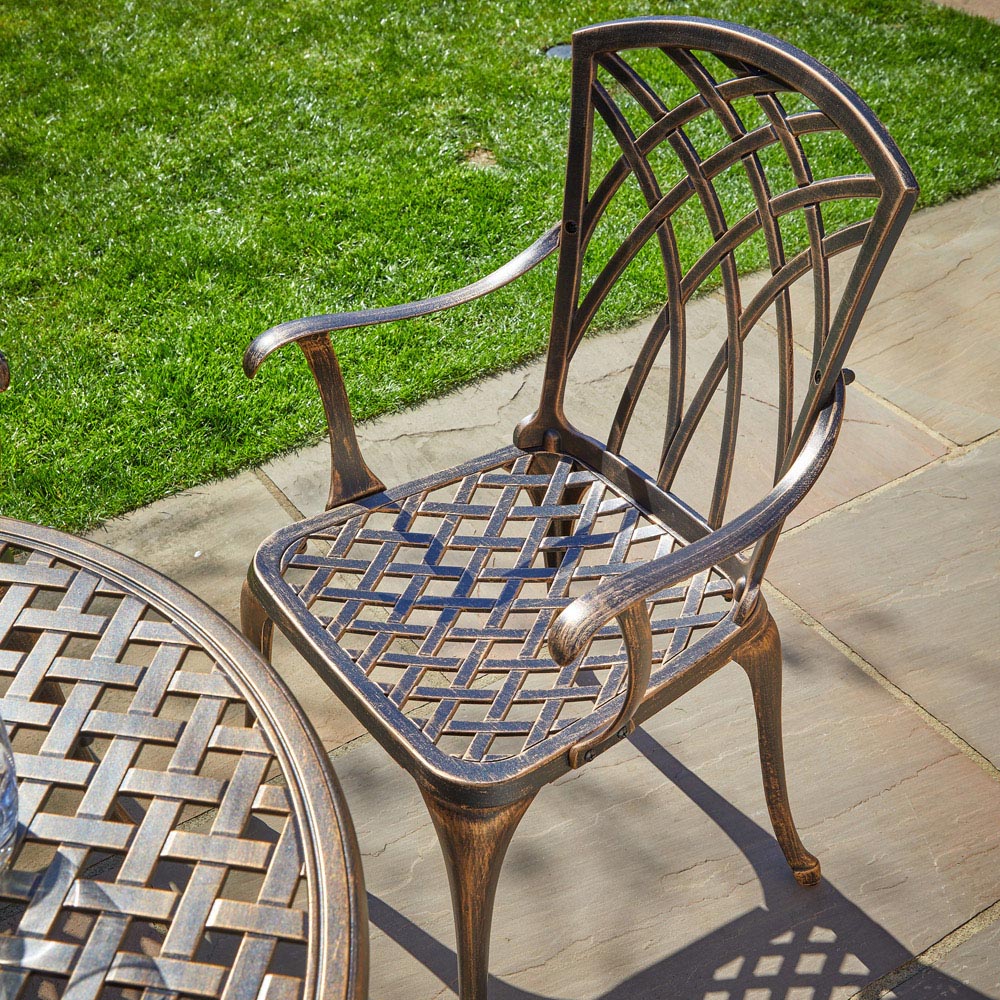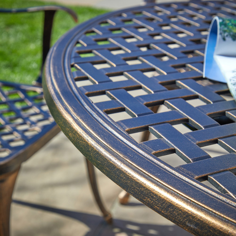 Crafted from robust aluminium, the Denali bistro set provides a durable and stylish addition to any outdoor space. This set features four chairs with an attractive lattice design, accompanied by a round table finished with a brown powder coating for enhanced weather resistance. Ideal for gardens, patios, or balconies, the table also includes a parasol hole, perfect for shading from the summer sun with your favourite garden umbrella. Delivered flat-packed for convenient home assembly, the table supports a maximum weight of 60kg, while each chair can hold up to 120kg.