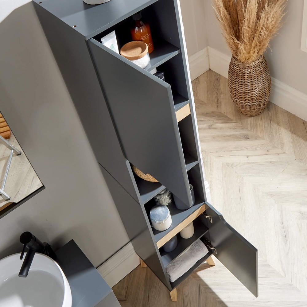 Enhance your storage solutions with the Home Source Florence 2 Door Tall Bathroom Storage Unit, presented in a chic grey finish. Ideal for bathrooms, hallways, and beyond, this unit is constructed from fully painted grey MDF, complemented by stylish cut-away handles that reveal attractive pine detailing. The matching solid wood legs, arranged in a cross frame design, not only elevate the cabinet for convenient cleaning but also introduce a touch of contemporary elegance to your home.