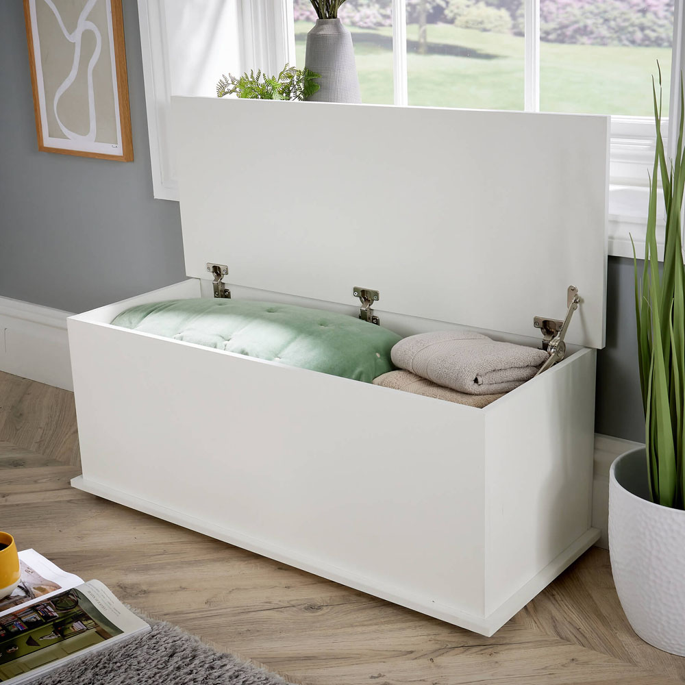 This Malmo Ottoman Storage Chest provides a stylish storage solution for any room. Featuring a hinged lid, this versatile piece would be equally at home in the living room, bedroom, or hallway. Delivered flat packed for easy home assembly. Size: (W) 99cm x (D) 39cm x (H) 45cm.