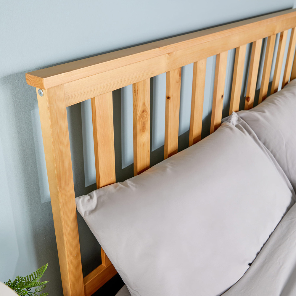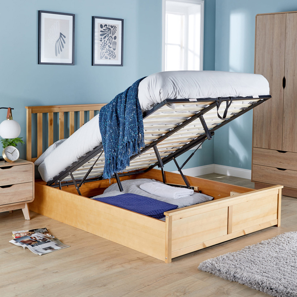 This elegant and practical double ottoman bed frame offers a wealth of much-needed storage without sacrificing style. Measuring 4ft 6in, this stunning yet simple bed is crafted from high-quality pine wood, finished with a gorgeous natural oak effect. Simply lift the bottom slats to access the hidden storage area, perfect for keeping your belongings tidied away. Dimensions: H120 x W137 x L190cm. Size: Double.