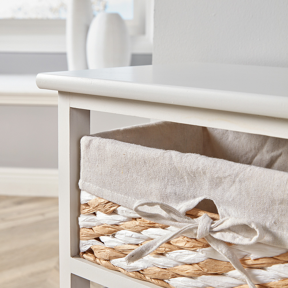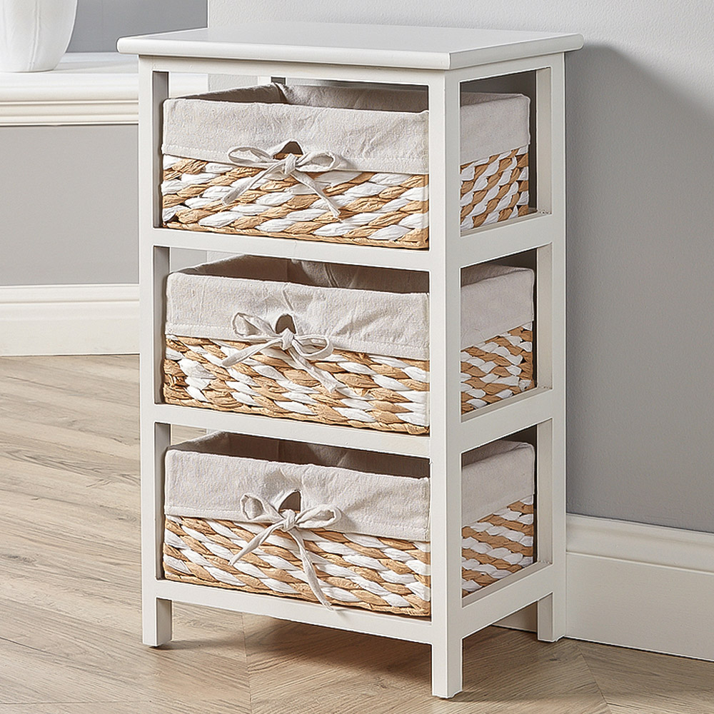 The Norfolk 3-Basket Wooden Cabinet, available in white, is the perfect blend of style and utility for your home. Constructed from durable MDF and solid wood, and featuring a sturdy 15mm thick top, this cabinet adds a touch of rustic elegance to any room. The three fully-lined, woven baskets offer ample storage space, sliding effortlessly within the sleek white frame. Ideal for decluttering shoes, clothing, toiletries, accessories and more, this cabinet arrives fully assembled and ready to enhance your home organisation.