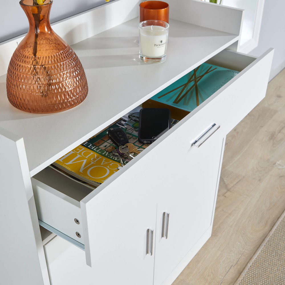 Declutter your hallway with the Novara minimalist shoe storage cabinet. This stylish and contemporary cabinet is crafted from durable particle board and MDF and offers a sleek storage solution for your footwear, keeping your space clutter-free. The aluminium handle provides easy access, and the flat-packed design allows for simple home assembly, making it an ideal addition to your home. Dimensions: (W) 82cm x (D) 34cm x (H) 90cm.