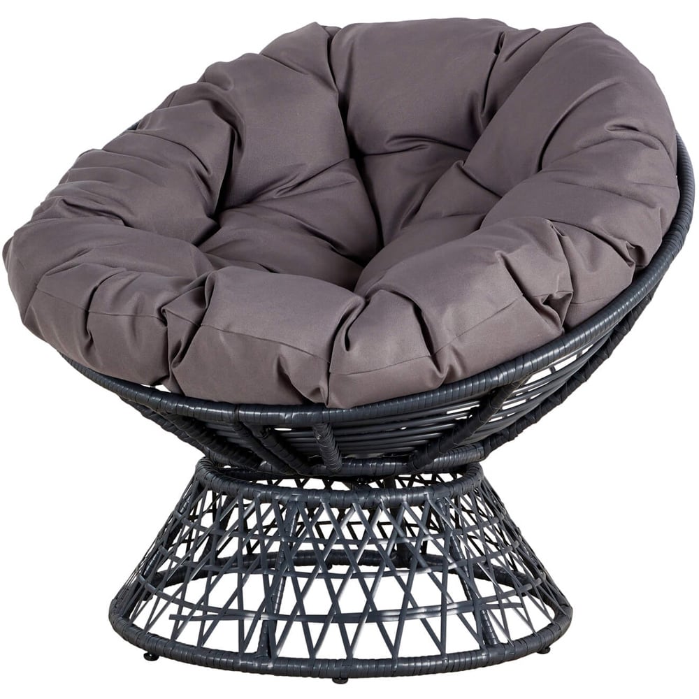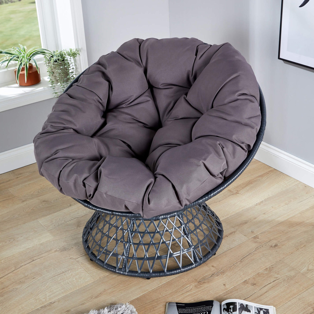 Create a cosy escape, indoors or out, with the stylish Home Source Oasis Dark Grey Cushioned Round Papasan Chair, perfect for creating a cosy retreat. This chair isn't just about comfort; it's built to last, thanks to its durable 245g 100% polyester waterproof fabric. The elegant dark grey frame, complete with rattan detailing, adds a touch of sophistication to any garden or conservatory, blending seamlessly with your existing décor. It's a chic and comfortable addition to your favourite relaxation spot. Maximum User Weight: 120kg.