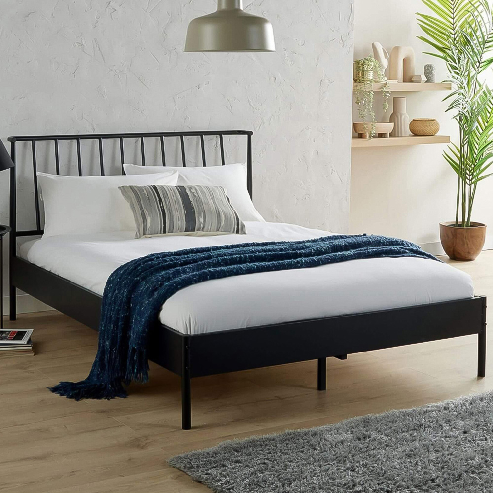 Introduce a striking contrast to your sleep space with this modern metal platform bed frame. Expertly crafted from robust and long-lasting metal, the frame boasts a jet black finish, lending a luxurious vibe that beautifully complements neutral décor and furnishings. The base features a subtly tapered design, creating a contemporary open space beneath the bed, ideal for storage or a minimalist, spacious aesthetic. A slender, ladder-style headboard provides a striking contrast against the solid base. Floor clearance: 18 cm.