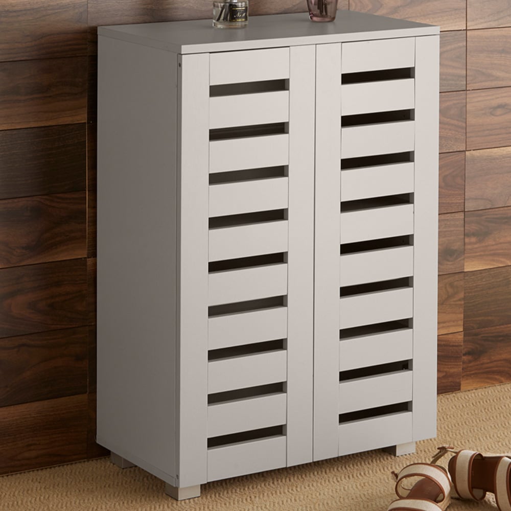 This grey, two-door shoe cabinet offers a stylish storage solution for your footwear. Ideal for creating a clutter-free hallway or bedroom, this sleek and minimalist cabinet provides ample space for your shoes. Featuring slatted doors and a smooth, flat top, it's perfect for displaying decorative items. A chic and understated addition to any home. Dimensions: (W) 60cm (D) 33cm (H) 87cm.