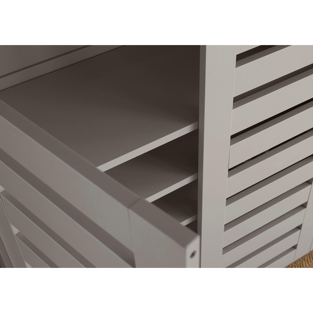 Searching for the perfect shoe storage solution? This grey, three-door shoe cabinet offers a sleek and minimalist design that effortlessly complements any home décor. Ideal for households seeking to declutter, it provides ample space to neatly store footwear, keeping your living area tidy and organised. Your footwear is easily accessed through the simple-to-open, slatted cabinet doors, maintaining a clean and modern aesthetic. An elegant but modest addition to any home. Dimensions: (W) 114cm x (D) 33.6cm x (H) 98.2cm.