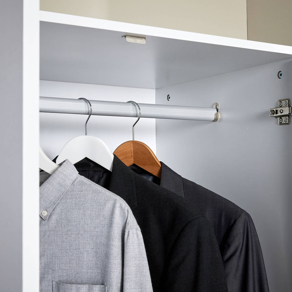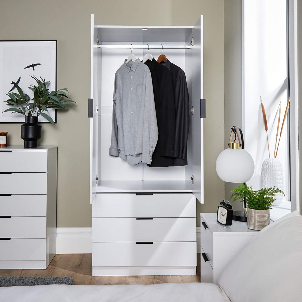Keep your bedroom organised and clutter-free with our Phoenix 3-drawer, 2-door Wardrobe. Finished in a crisp, classic white, this wardrobe will bring a sense of calm and brightness to your space. Inside, you'll find a handy shelf, perfect for storing shoes, boots and boxes. The extra-wide clothes rail is ideal for keeping your jackets, trousers, dresses, skirts and coats neatly hung and protected from dust, moths and sun damage. Furthermore, the wardrobe features 3 base drawers with smooth-running metal runners, providing ample storage for folded clothes, bedding sets and blankets. Size: (W) 75cm (D) 50cm (H) 181cm.