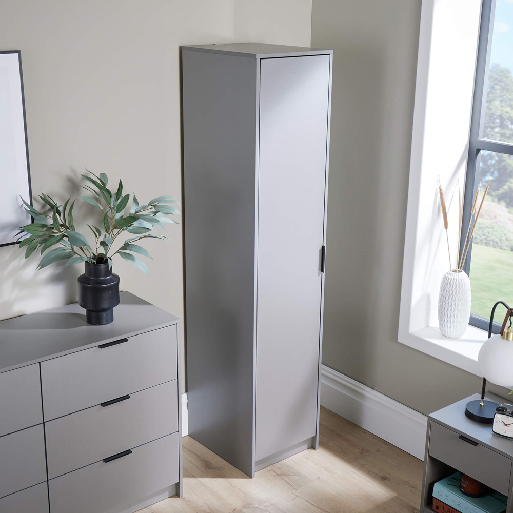 Introduce streamlined sophistication to your bedroom with the Phoenix 1 Door Wardrobe, presented in a sleek grey finish. Designed to maximise space, this compact wardrobe provides a stylish storage solution for any modern home. Inside, you'll find a full-width hanging rail, perfect for keeping your clothes organised and crease-free. Additional storage is provided by the top and base shelves, ideal for shoes, boxes, and accessories. The top of the wardrobe can also be used for extra storage, making it a highly functional piece, especially where space is at a premium. Versatile in design, the door can be fitted to open on either side, ensuring it integrates seamlessly into your existing room layout.