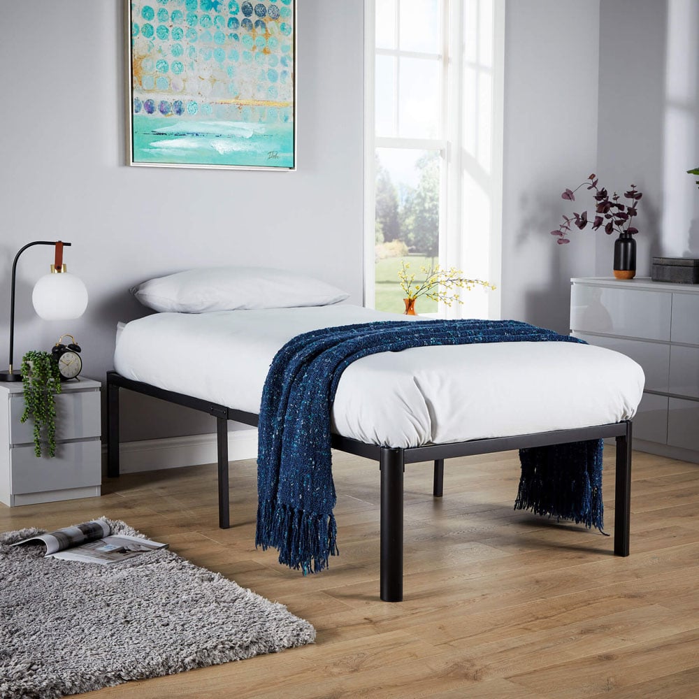 The Home Source Florida Single Bed Frame in Grey is a simple yet stylish addition to any bedroom. This sturdy steel frame is finished in sleek black and features ten rows of robust metal slats, ensuring excellent mattress support and stability. The low-end design offers a modern touch, while the flat-packed delivery allows for easy self-assembly. With dimensions of H40 x W90 x L190cm, this bed frame combines durability and style seamlessly.