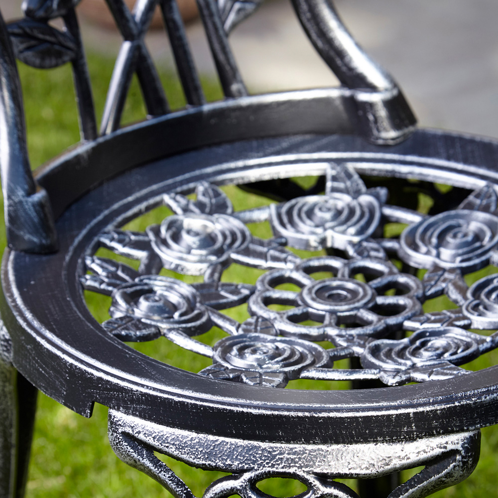 Bring timeless elegance to your garden with the Rose Outdoor Bistro Set in Black. Part of our exclusive Garden Furniture Collection, this three-piece ensemble includes a round table and two chairs, each meticulously crafted from 100% cast aluminium. Strong yet surprisingly lightweight, this set features a weatherproof painted finish, ensuring lasting beauty through the seasons. Admire the Victorian-inspired trailing rose leaf design and elegant Queen Anne-style legs, perfect for morning coffee or al fresco dining. This outdoor set is an ideal addition to any patio and the table also includes a convenient parasol hole, allowing you to enjoy your outdoor space in sun or shade.