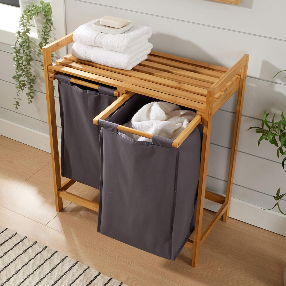 Home Source Walton Bamboo Laundry Basket with 2 Grey Fabric Compartment