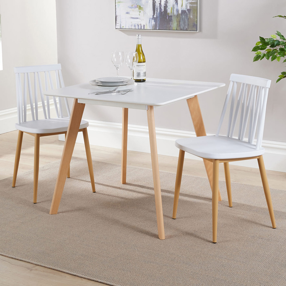 A contemporary dining solution for smaller spaces, this compact table is ideal for two. Featuring sleek edges and an angular design, it can be positioned against a wall or take centre stage in your room. The white MDF tabletop is sturdy, durable and easily cleaned with a damp cloth to maintain its condition. Complemented by sleek wooden legs.