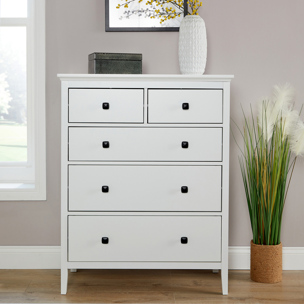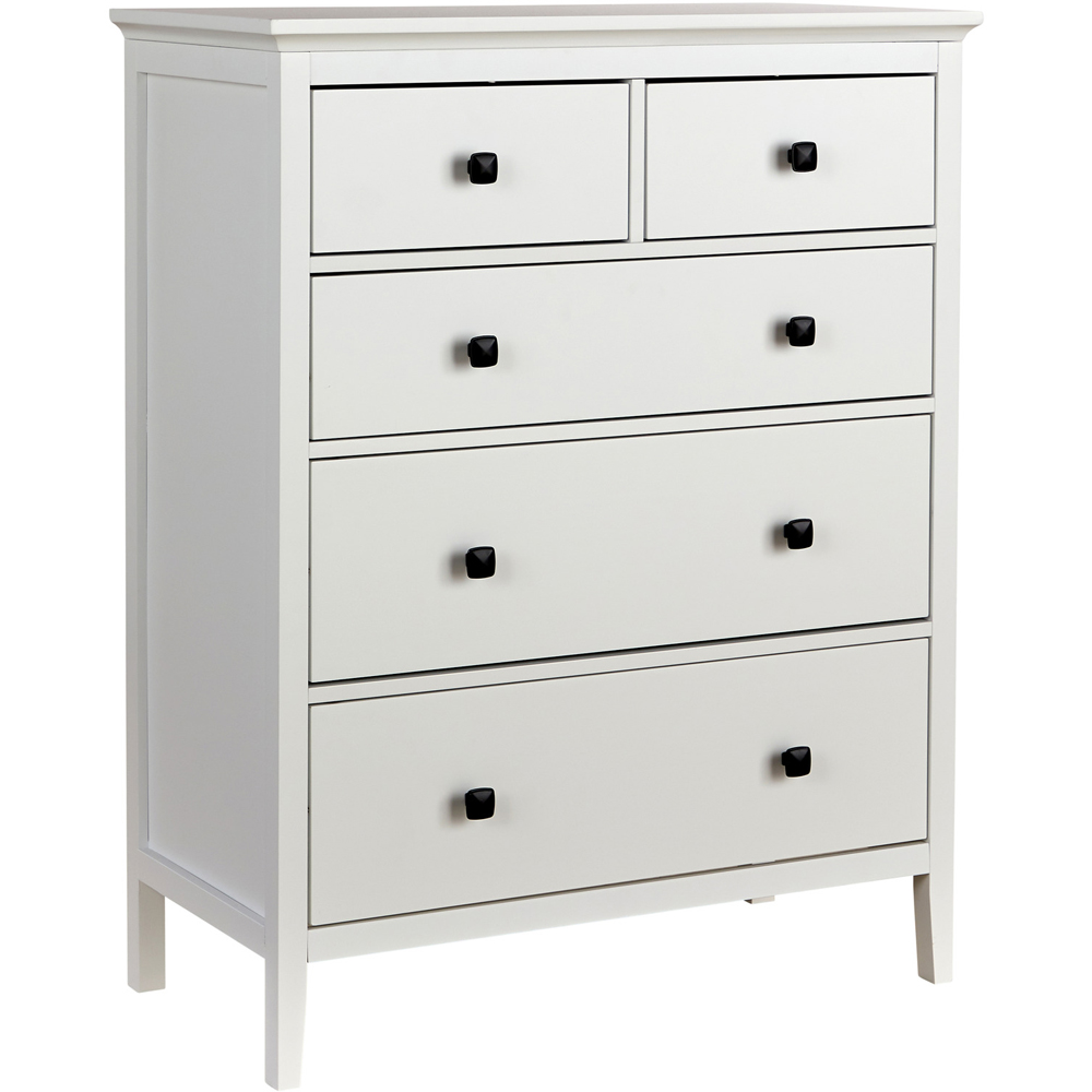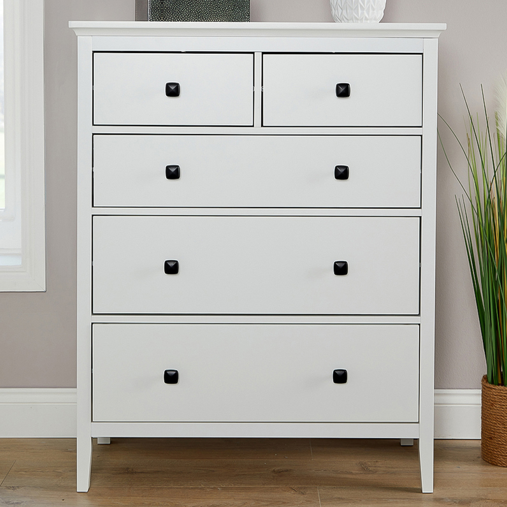 This five-drawer chest offers a stylish storage solution for any room. Constructed from quality MDF with a clean white painted finish, its compact design brings a touch of elegance to your home. Each drawer features smooth, ball-bearing runners for ease of use. Delivered flat-packed, this chest of drawers ensures straightforward and simple home assembly, while providing ample space to keep clothing and essentials neatly organised in the five spacious drawers.