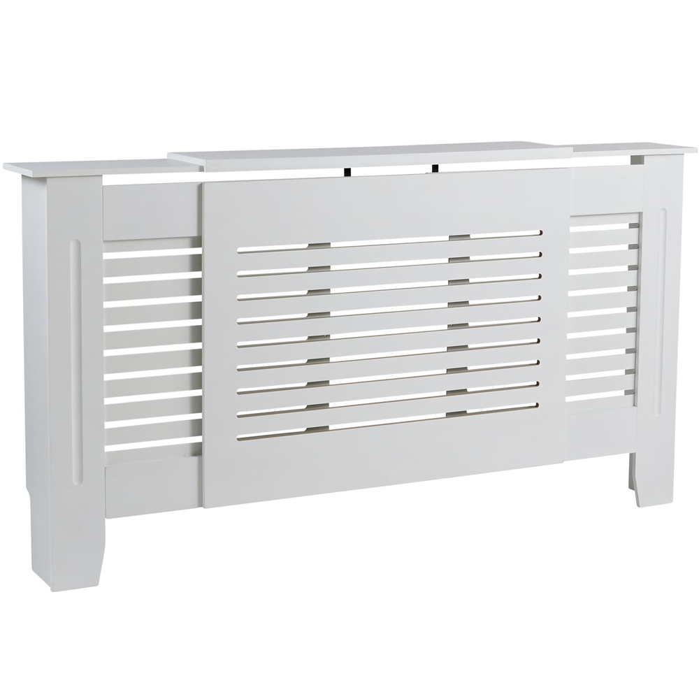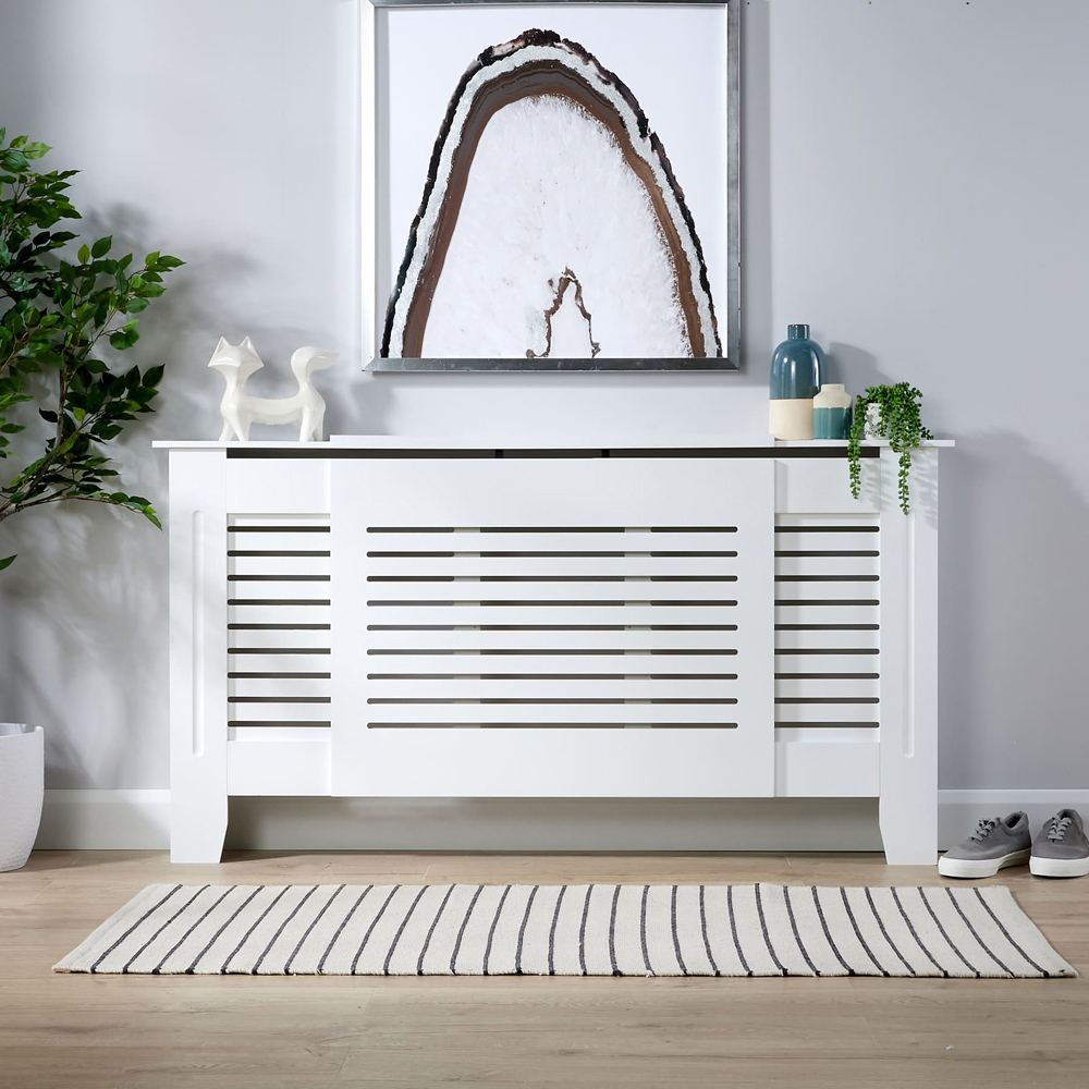 Enhance your space with the versatile extending radiator cover, perfect for any home decor. This sturdy MDF cover adapts to your needs while featuring a decorative slatted grill design that promotes proper heat flow and a convenient top shelf for showcasing charming home accents.
