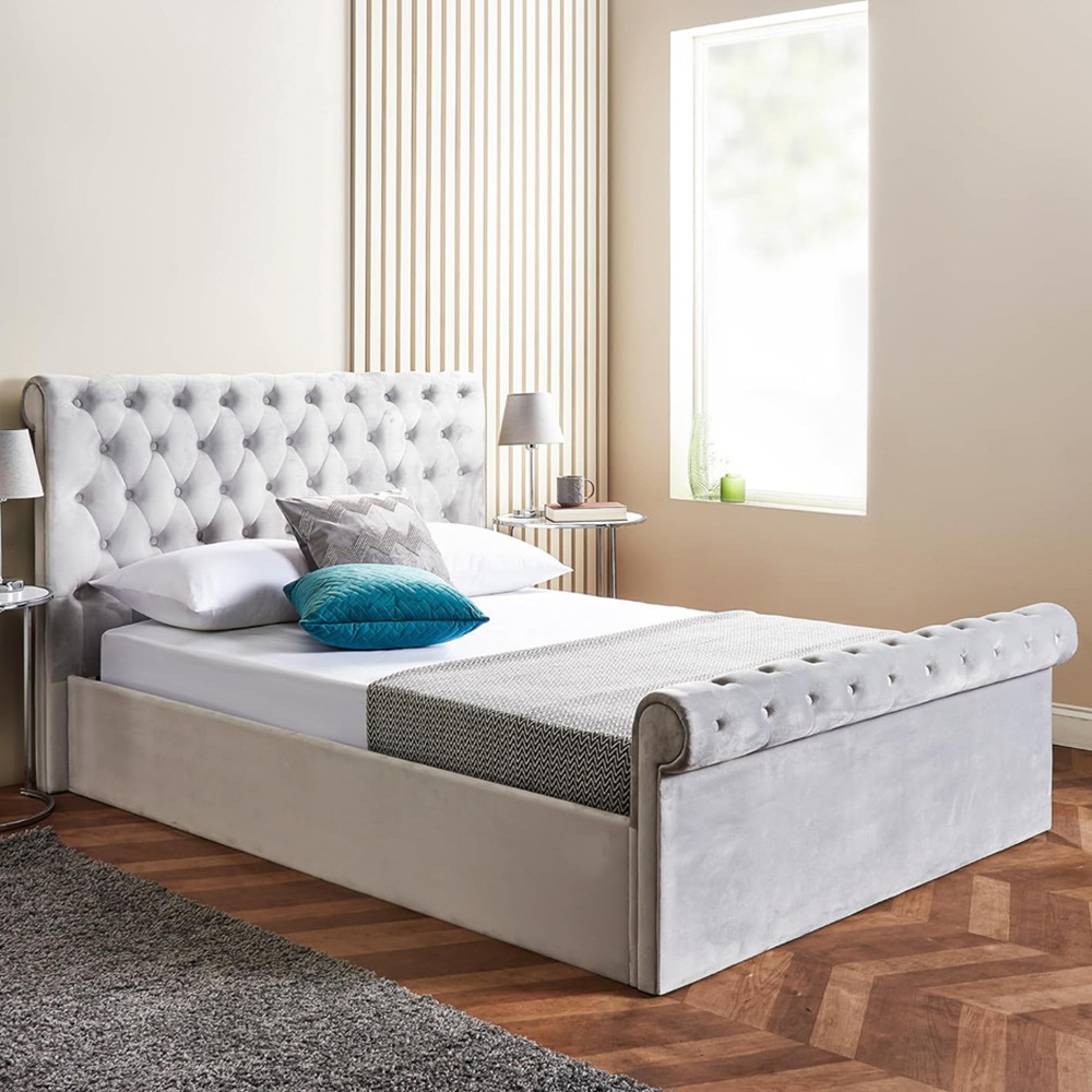 With its elegant sleigh design and button detailing, the Home Treats king-size grey brushed velvet ottoman bed with mattress brings a touch of glamour to any bedroom. This stylish bed boasts a generous under-bed storage compartment, perfect for maximising space. The side lift mechanism can be installed to open from either the left or right, and a fabric base is included. Enjoy enhanced comfort thanks to the extra-padded premium finish on the headboard, footboard, base, and sides. Sprung wooden slats provide excellent support, distributing body and mattress weight evenly. Crafted from high-quality materials, this durable bed features a robust steel inner frame, strong centre support beams and slats, plus additional middle support legs. A pocket-sprung mattress with a quilted comfort top layer is also included for a restful night's sleep. It features a grey two-tone brushed velvet.