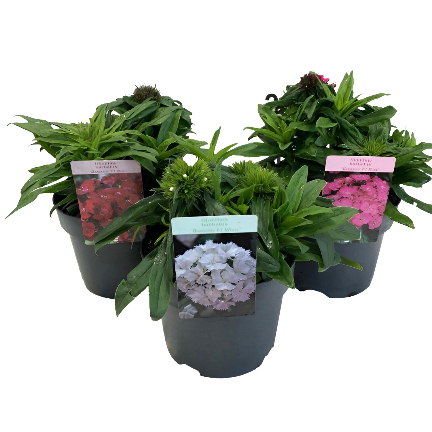 A vibrant mix of perennial Dianthus Barbatus, flourishing in 19cm pots. Showcasing a delightful array of pink, red and white blooms, this variety thrives in both containers and garden beds. A profusion of flowers ensures a stunning display throughout the season.