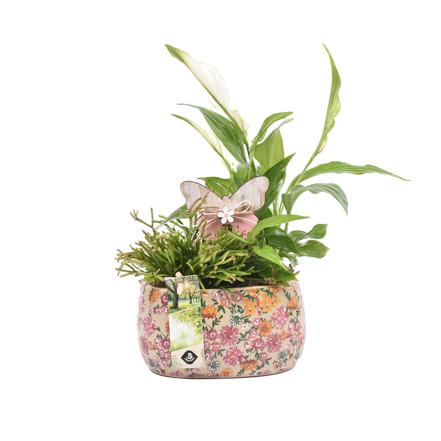 Add a touch of nature to your space with this Plant Arrangement in Flowering Oval Ceramic Pot. This houseplant arrangement with a soft, romantic, and serene look makes a perfect gift for Valentine's Day or anniversaries. Moreover, it is planted in a beautiful floral ceramic pot to exude style and elegance.
