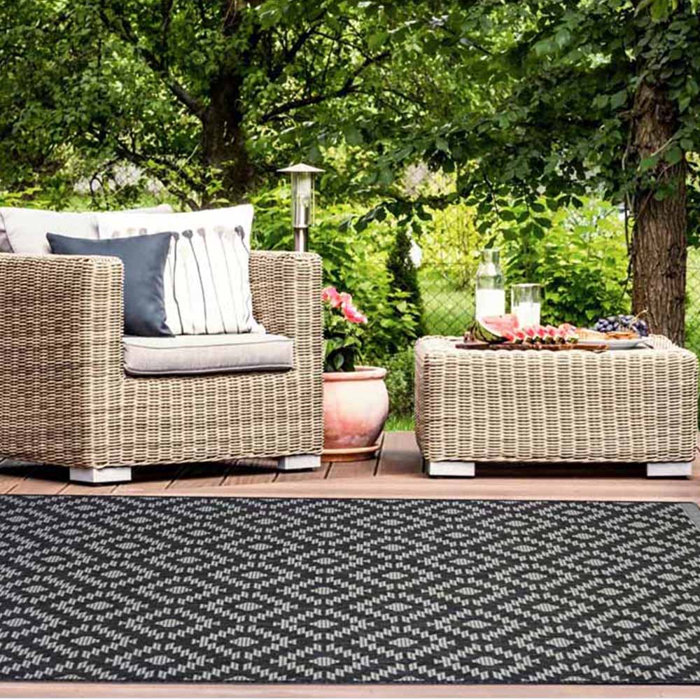 Enhance your home with the Genesis Black Rug, a stylish flatweave rug built for modern living. Its durable and easy-care construction makes it ideal for high-traffic areas, both indoors and outdoors. The geometric tile design adds a contemporary touch, while water resistance and UV protection ensure it looks great even in sunny garden settings. For use on hard floors, a rug grip is recommended. This rug measures 160 x 230cm, perfect for expanding your living space.