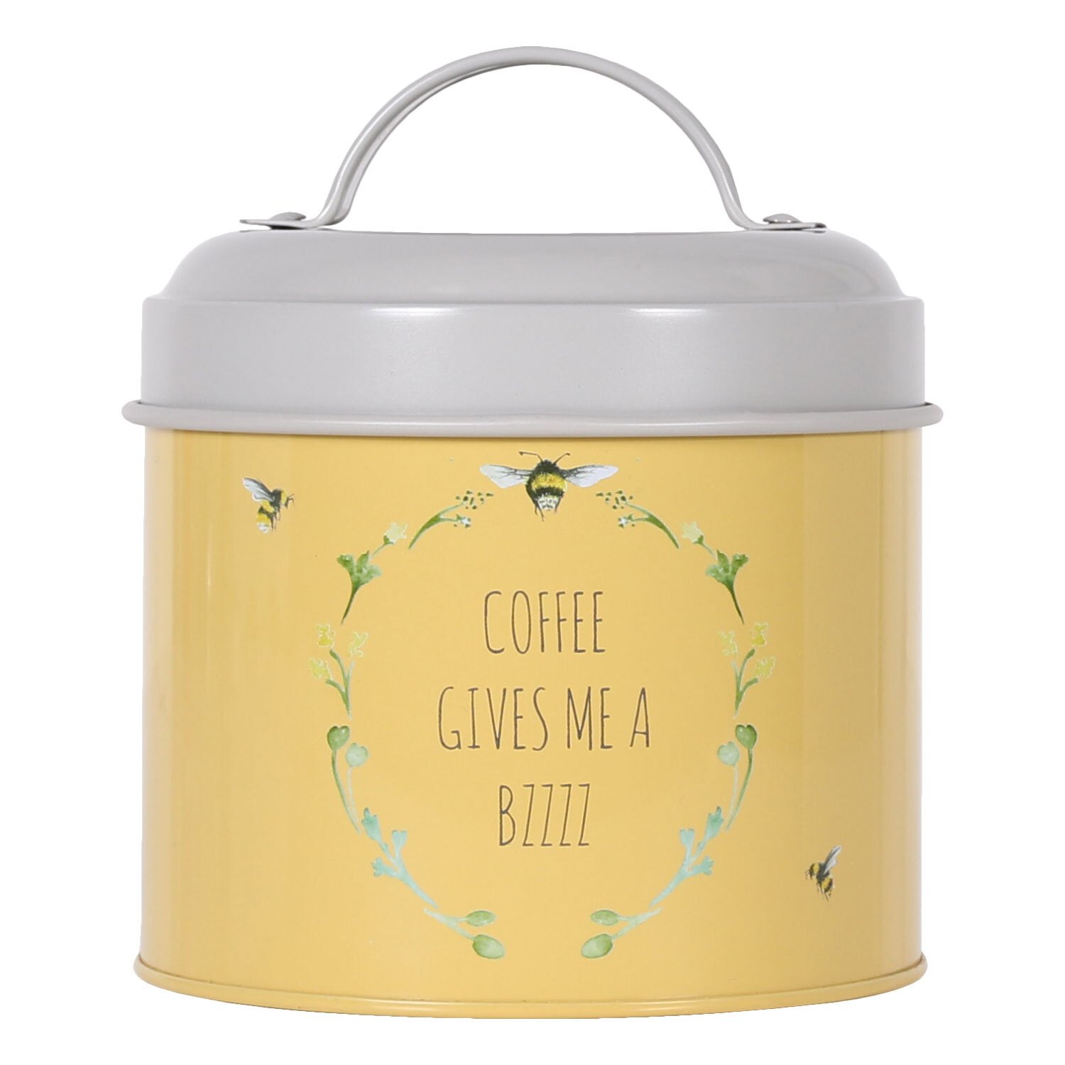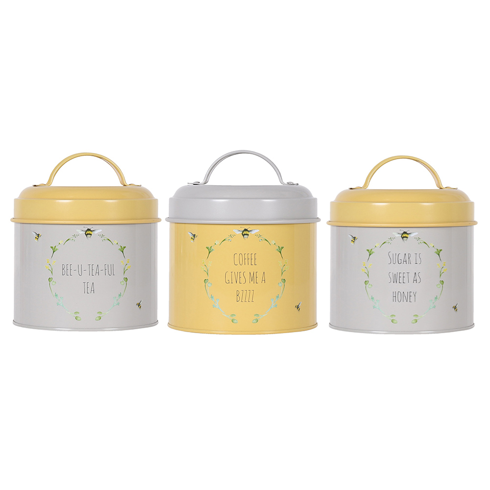 Bring a buzz to your kitchen storage with this charming set of three Honeycomb Canisters. Sporting alternating bands of yellow and grey, each canister is adorned with delightful honey bees and a ring of foliage. A sweet and playful pun relating to the contents sits nestled within the foliage, adding a touch of lighthearted fun to your countertop. Perfect for storing tea, coffee, and sugar within these bee-autiful containers.