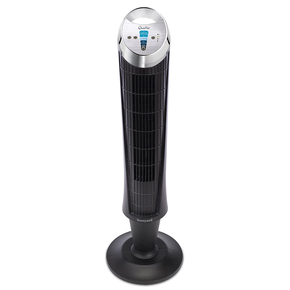 Experience the ultimate in quiet cooling with the Honeywell QuietSet Black Tower Fan. This 31-inch tower boasts five speed settings and 75-degree oscillation for comprehensive room coverage. Enjoy a convenient timer function, automatically shutting off after 1, 2, 4, or 8 hours. A handy remote control stores neatly on the fan's back. Effortless assembly – no tools required.