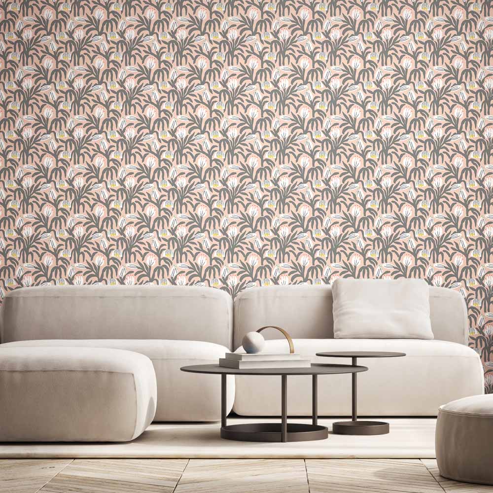 This vibrant wallpaper design playfully reimagines nature, blending abstract arching leaves and chunky flower heads in a striking colour palette. Its joyful, graphic style injects modern energy into any room.