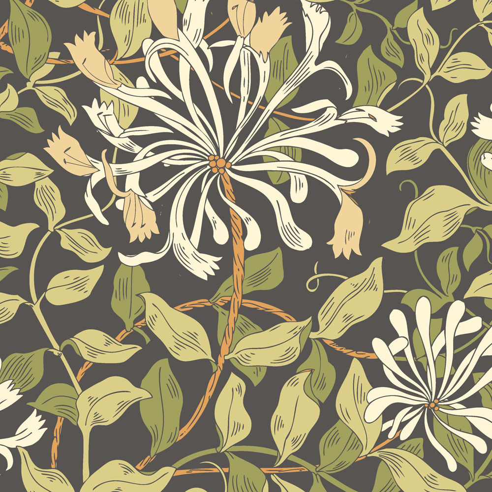 This stunning wallpaper captures the essence of the Arts and Crafts movement, showcasing intertwining honeysuckle vines and leaves. Inspired by a May Morris illustration, this design pays homage to the Arts and Crafts design era.