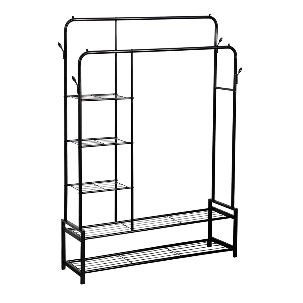 This freestanding double clothes rail, measuring 4ft in length, 5.5ft in height, and 1ft in depth, is the perfect solution for decluttering your bedroom or guest room. The rail features two shoe shelves and three clothing shelves, maximizing your storage space. Stoppers on the rail ends ensure your clothes stay securely in place. Crafted from steel with a durable black powder-coated finish, it seamlessly blends into any décor.