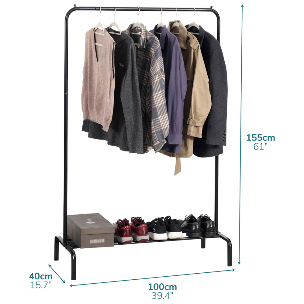 This freestanding clothes rail, perfect for any bedroom or guest room, is designed for effortless organisation. The 3ft long, 5ft high, and 1ft deep rail features stoppers to securely hold your clothes in place. Crafted from steel with a durable black powder-coated finish, it complements any décor.