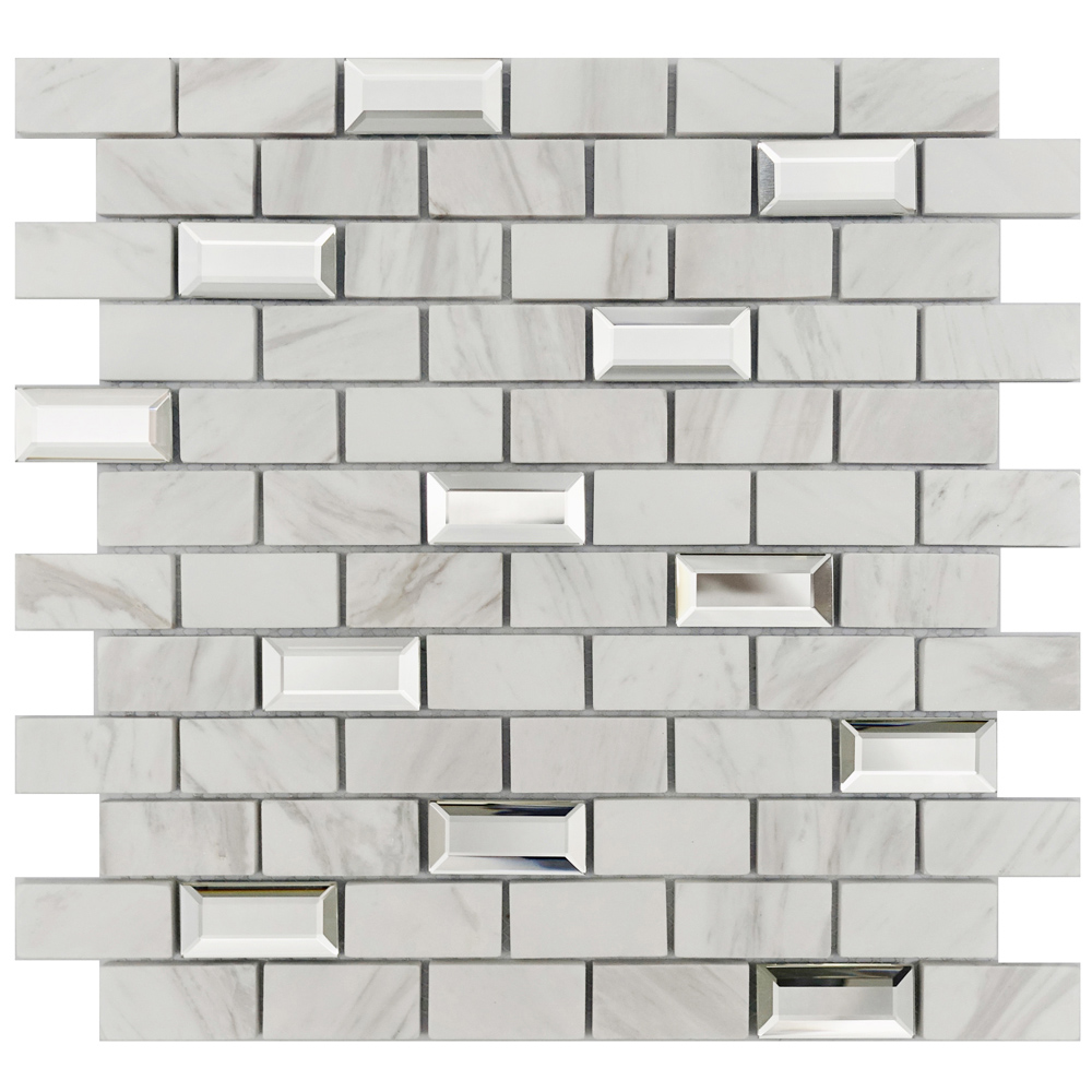 Calacatta Luxe mosaic tile: a perfect blend of mirrored bevel glass and Calacatta marble bricks, adding glamour and reflection to any tiled area. This luxurious tile creates a stunning, reflective finish and looks especially great with black bathroom accessories.