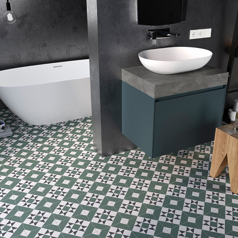 Introduce a bold statement to your home with the Diamond Green Mix tile. Showcasing a geometric, Victorian-inspired pattern in a green, grey and cream colour scheme, it will add a striking feature to any room. This bold pattern ensures a memorable and stylish impact within your space.