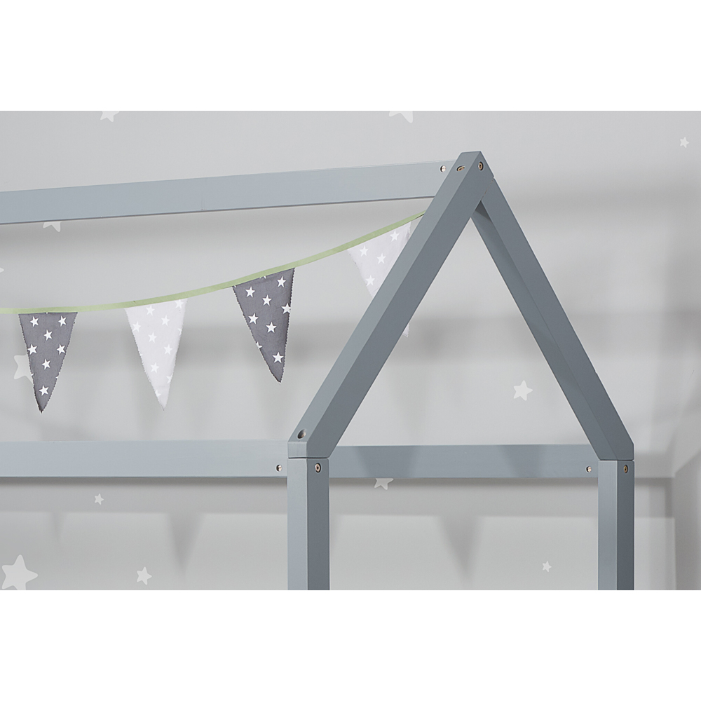Give your child their own space with this charming house-shaped single bed. This grey wooden bed frame creates a fun and inviting sleep space. Its solid slatted base provides firm mattress support and excellent airflow for lasting comfort. With a maximum weight capacity of 100kg, it',s perfect for little ones. Please note: this bed frame is designed for a UK standard single mattress only.