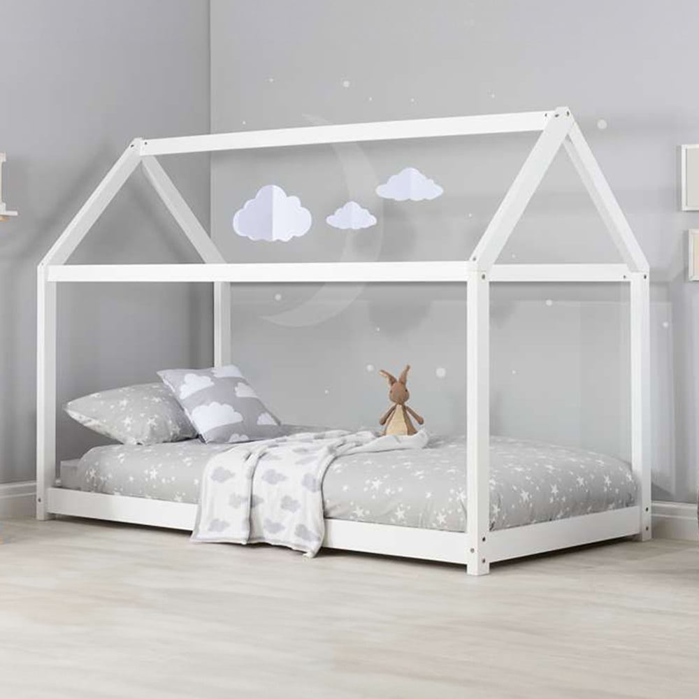 It',s time for your child',s independence with their very own house-shaped bed! This white wooden single bed frame is the perfect addition to your little one',s bedroom. The solid slatted base provides firm support and allows for excellent air circulation beneath the mattress, ensuring lasting comfort. With a maximum weight capacity of 100kg, and designed for a UK standard single mattress, this bed is ready to become the centrepiece of a delightful bedroom.