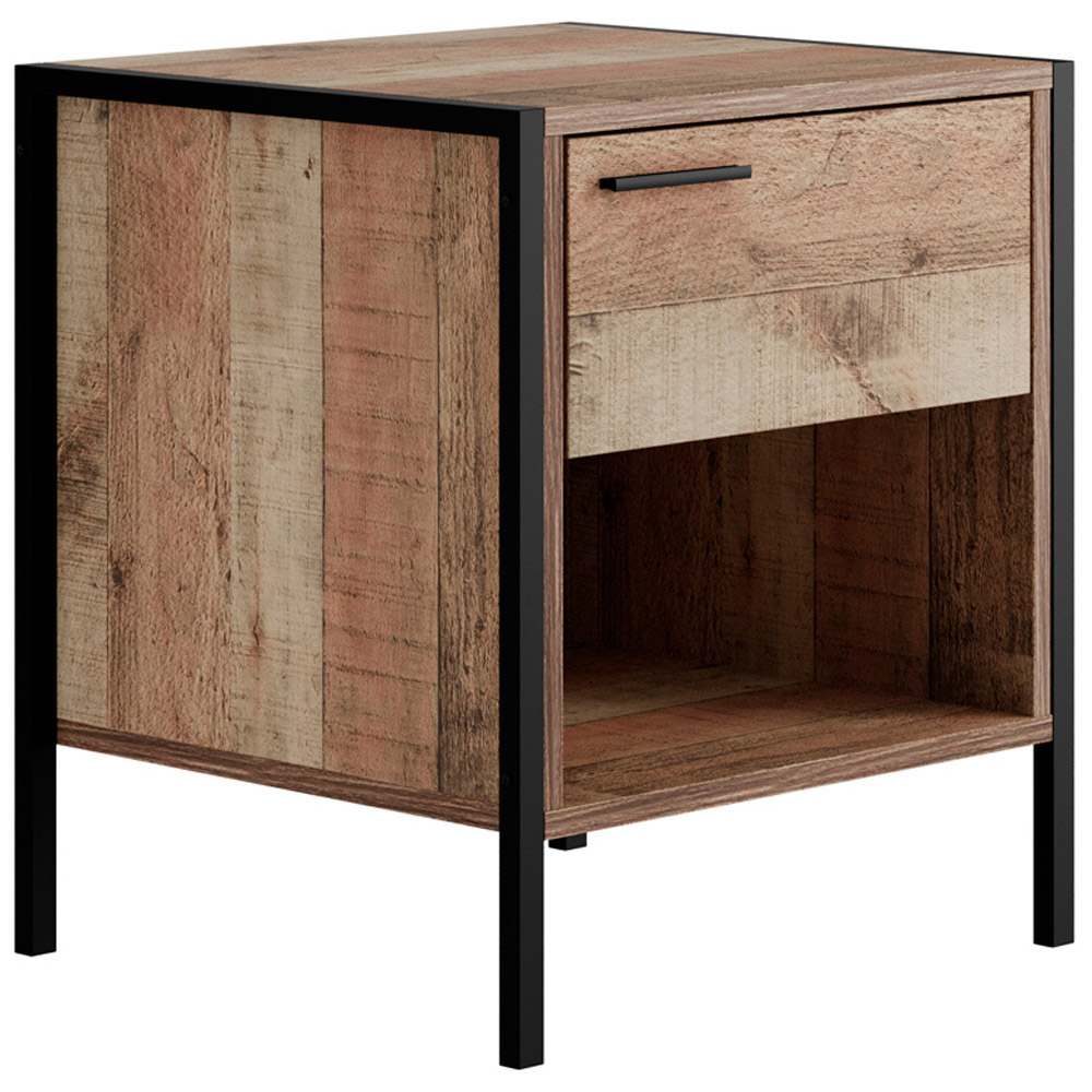 This Hoxton oak-effect bedside table effortlessly adds contemporary industrial style to any bedroom. Its stylish design is perfect for those seeking a chic update to their living space. The oak effect finish ensures it seamlessly complements modern interiors.