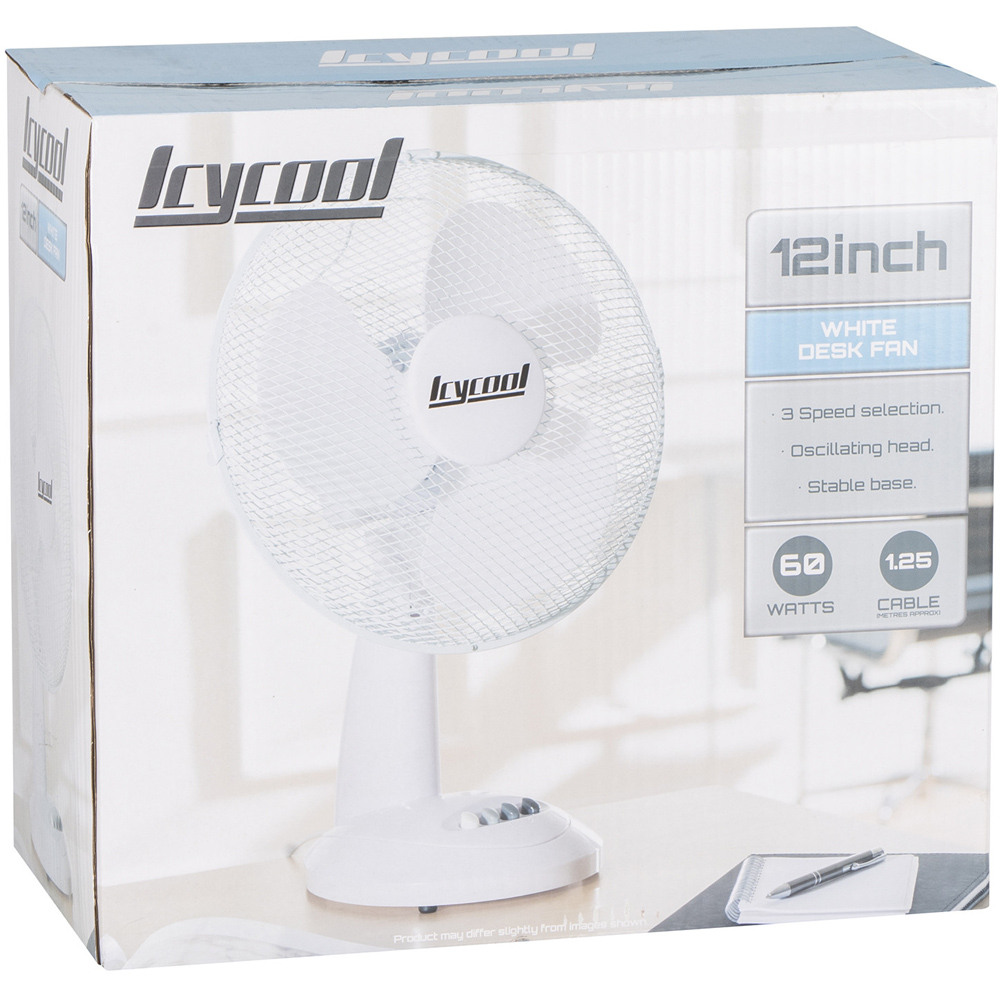 Stay cool and comfortable at home or in the office with this 12-inch Icycool White desk fan. Three speed settings let you customise your airflow, while the oscillating head ensures even cooling. Its stable base makes it perfect for any workspace.